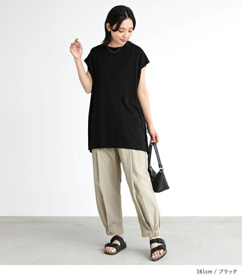長めの丈や、バックのキラキラ素材に惹かれて購入。 私は肩幅が広いので、フレンチスリーブと言うよりノンスリーブに。 脇も空いているので、上着が必要です。 何かのインナーに着ても涼しそうな素材なので、工夫して着てみます。 細身の方に良さそうです。
