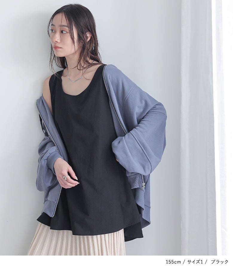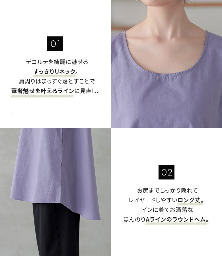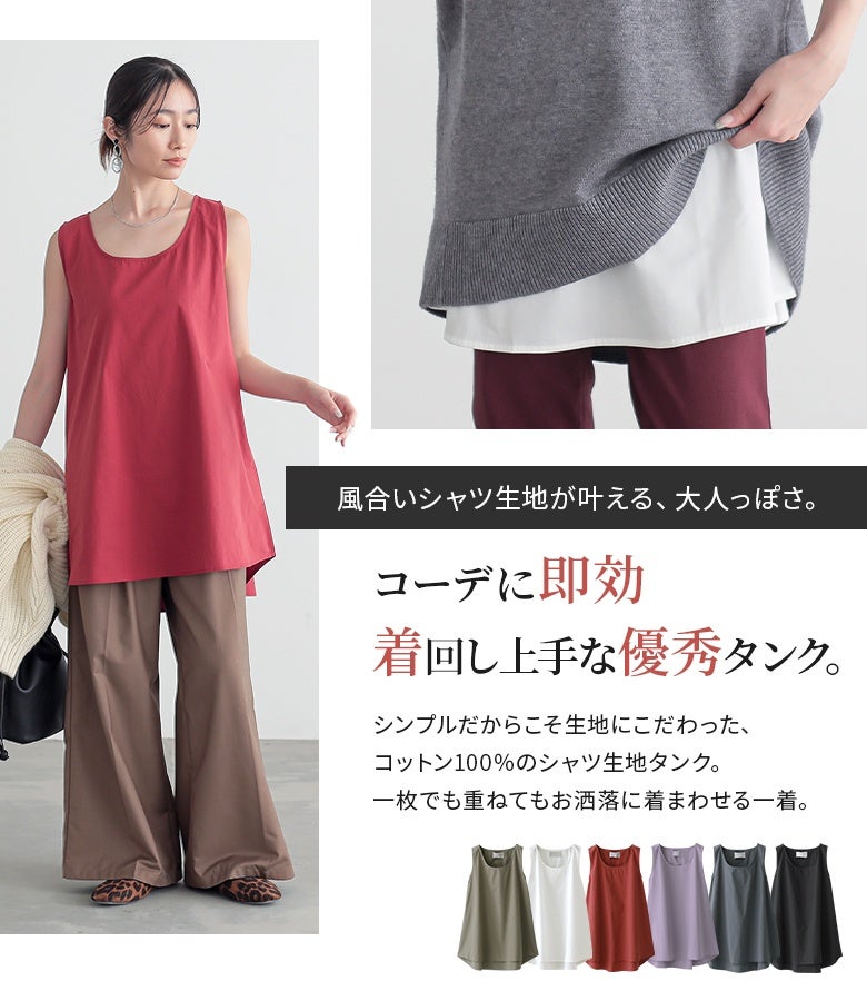 一枚でもレイヤードでも着まわせるシャツ生地タンク。すっきりとしたUネックに、華奢見えするよう肩周りのラインにこだわりました。お尻までしっかり隠すロング丈はレイヤードもしやすく、ほんのりAラインのラウンドヘムでインに着てもお洒落見えするデザインに。一枚で着ても身体のラインを拾いにくいシルエットになっています。