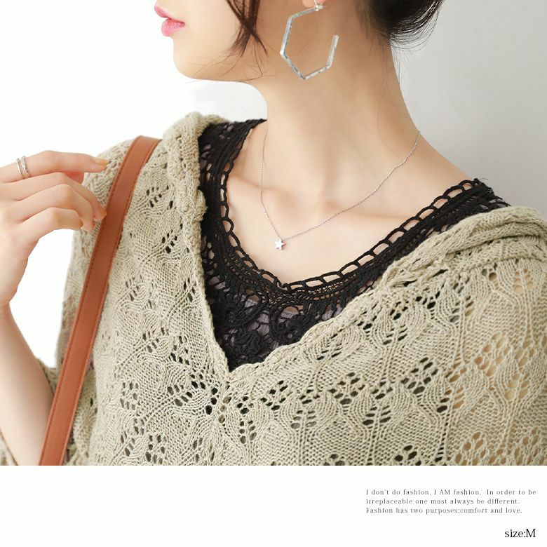 華奢な印象を高めるランダムリブと、配色の襟元レースが女性らしさを惹き立てる。