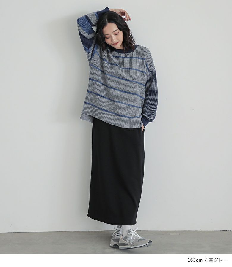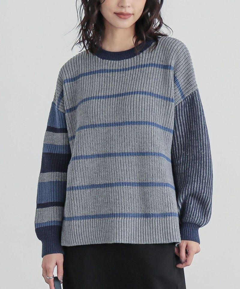アシンメトリーに配置したマルチボーダーと配色デザインが表情豊かなニット。