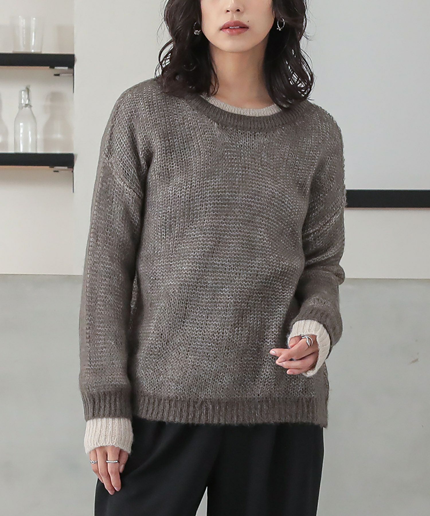 【2】 袖丈:手の甲真ん中位 着丈:ヒップ真ん中位 腕周り:ゆったり バスト:ややゆったり 全体:ゆったり
