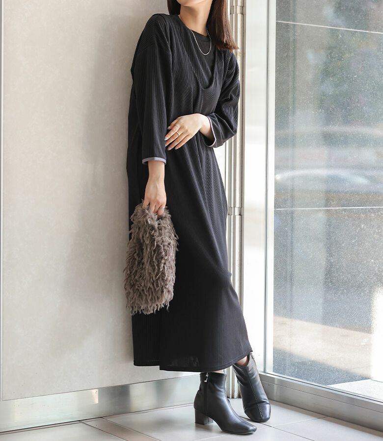 様々な着こなしが楽しめる、ワンピースとトップスのリブカットソーセット。トップスは、袖の異素材配色がさりげないアクセントになります。ワンピースは深めのVネックと裾のスリットで、抜け感をプラスします。それぞれリブ幅の切り替えがあり、表情をプラスします。