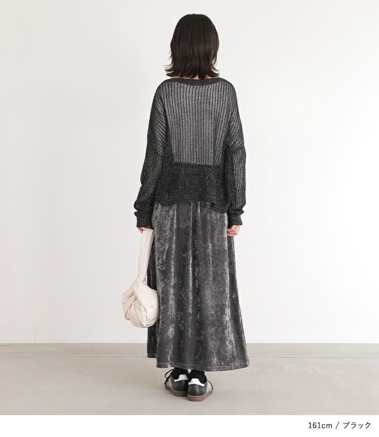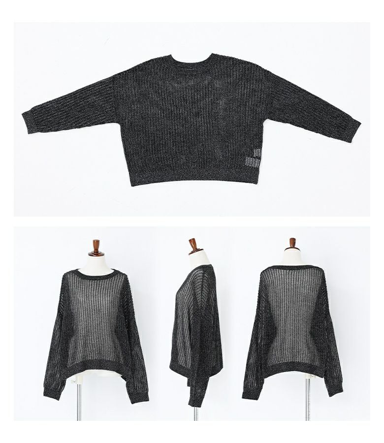 涼し気なメッシュ編みの長袖ニット。ラメのキラキラ感が、着るだけでお洒落に見せます。ヘルシーな肌見せができる程よい大きさの縦柄メッシュで、合わせるアイテムによってロングシーズン活躍します。
