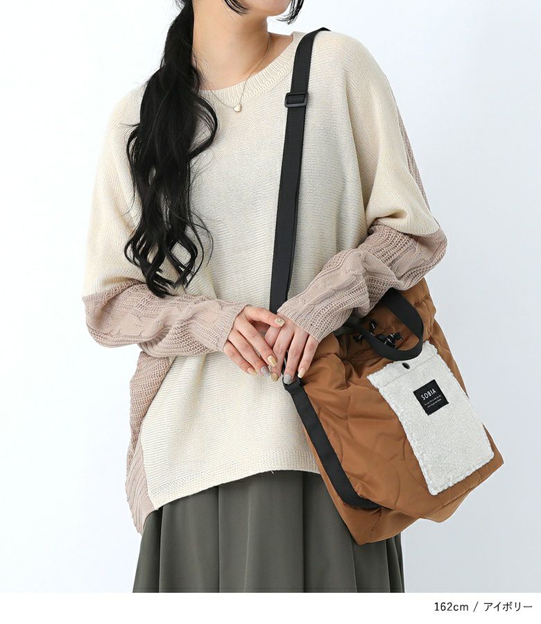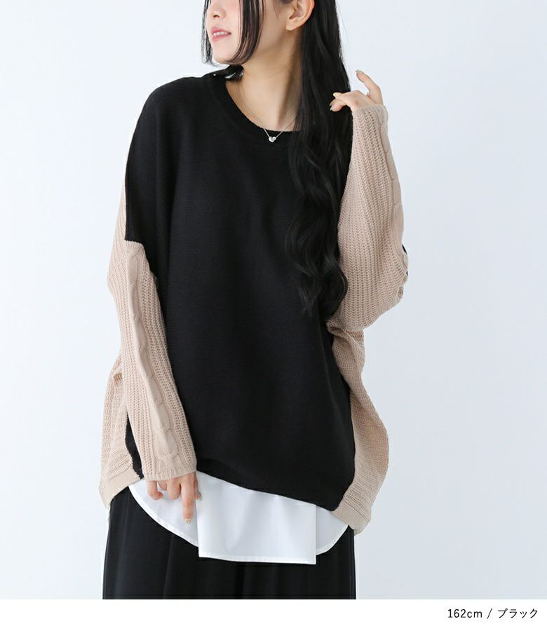 大人のコーディネートに取り入れやすい一枚で着てお洒落な配色ニット。袖部分のケーブル編みデザインがアクセントになっています。お尻まですっぽり隠れる丈感で、気になる体型をカバーできるシルエットです。