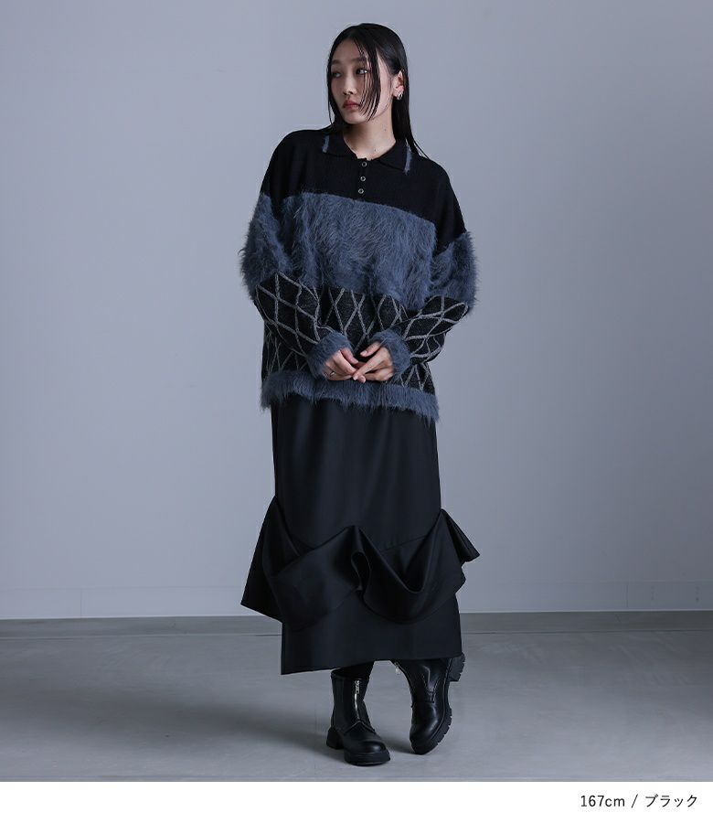 無地とシャギー糸、ダイヤ柄を切り替えたポロシャツ型のニット。柄部分は2色の糸を使用し、立体的に仕上げました。配色のシャギー部分はしっかり毛足のある糸で価値を出し、襟の端にもライン状に入れてポイントに。ボタンはマットシルバーで、細部までこだわったモードなアイテムです。