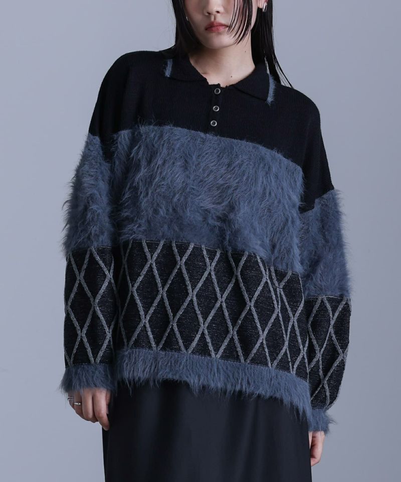 無地とシャギー糸、ダイヤ柄を切り替えたポロシャツ型のニット。