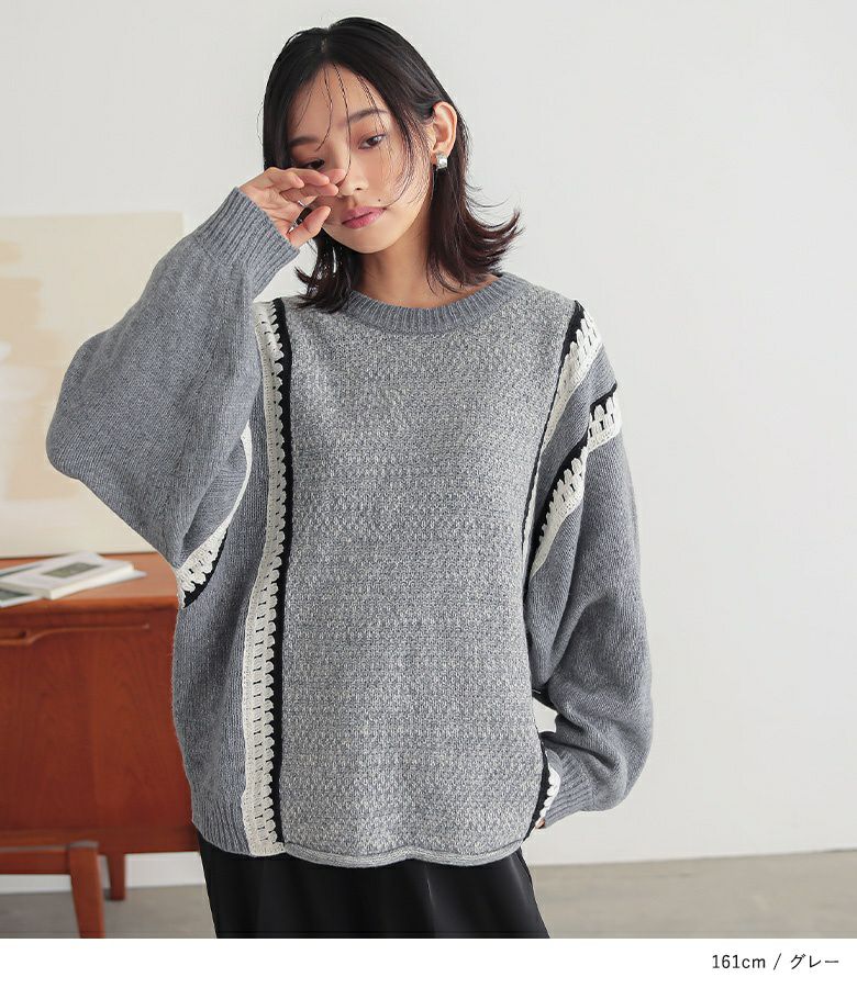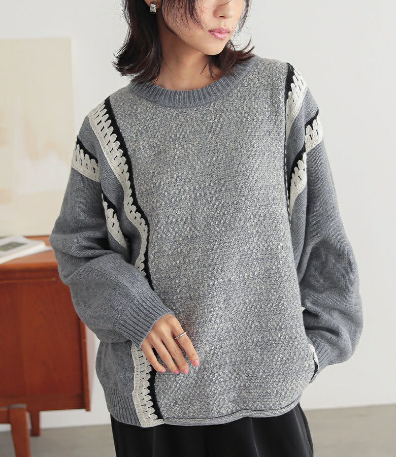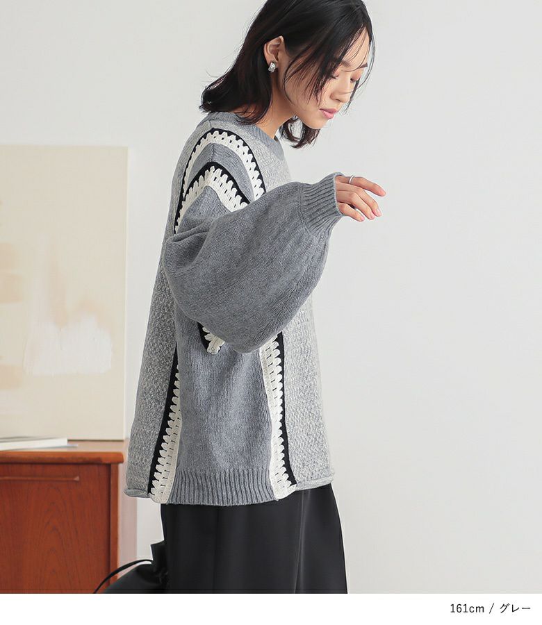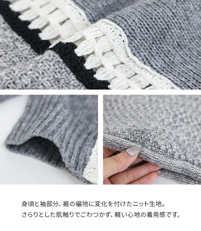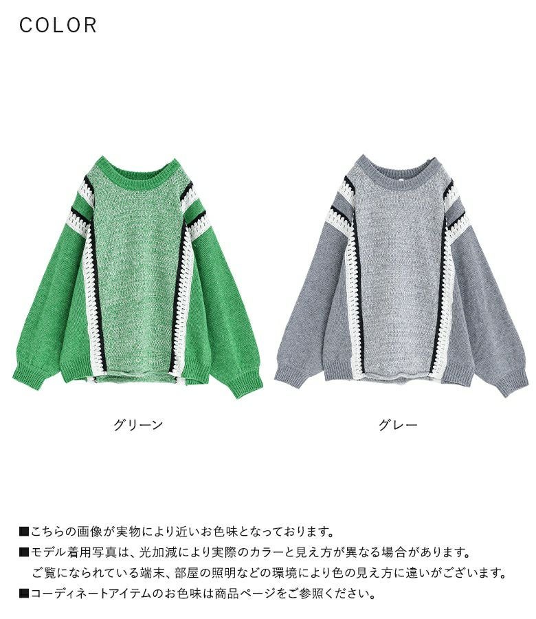 クロシェ編みの配色切替がポイントのぽわん袖ニットトップス。