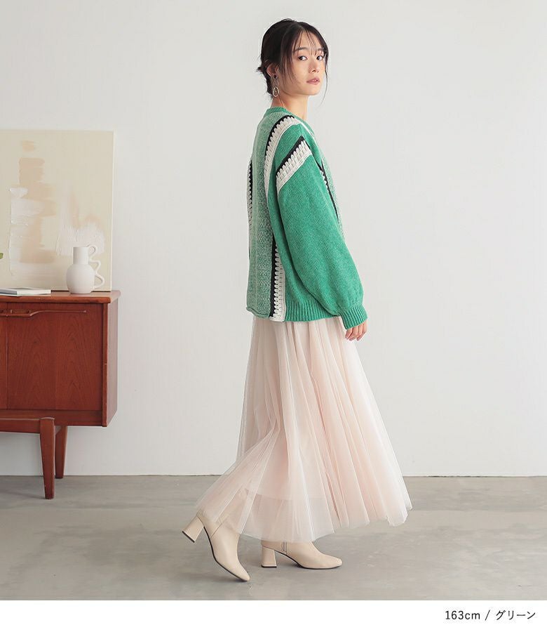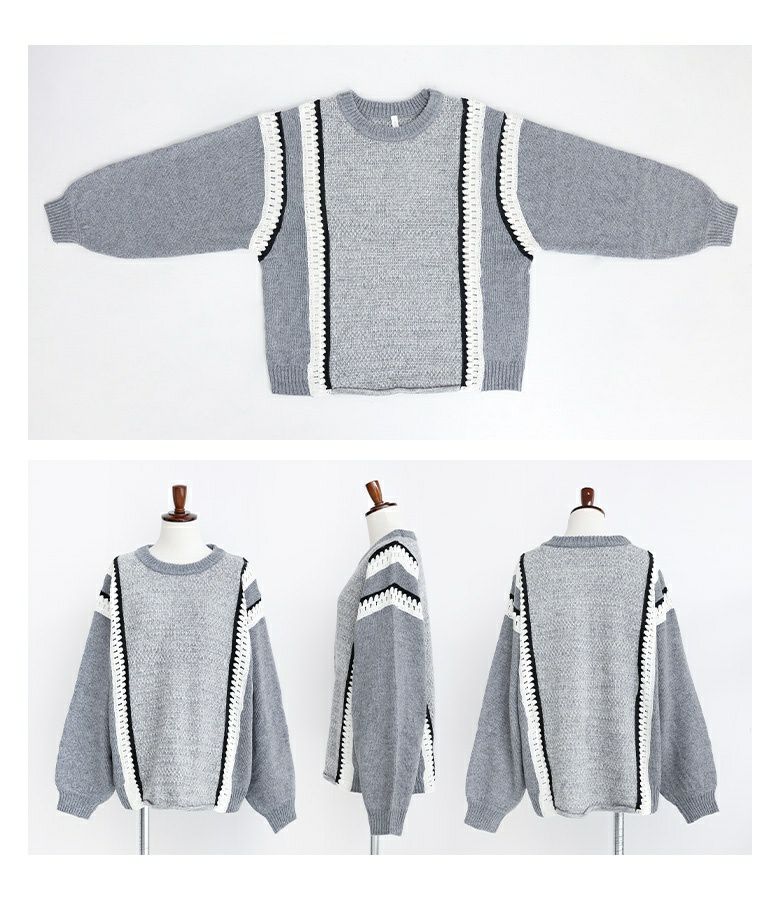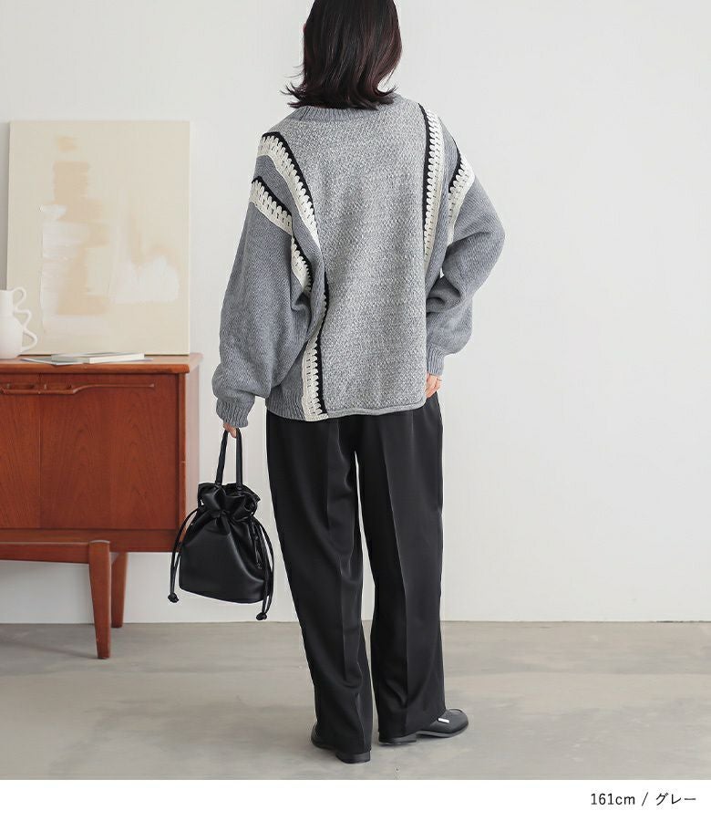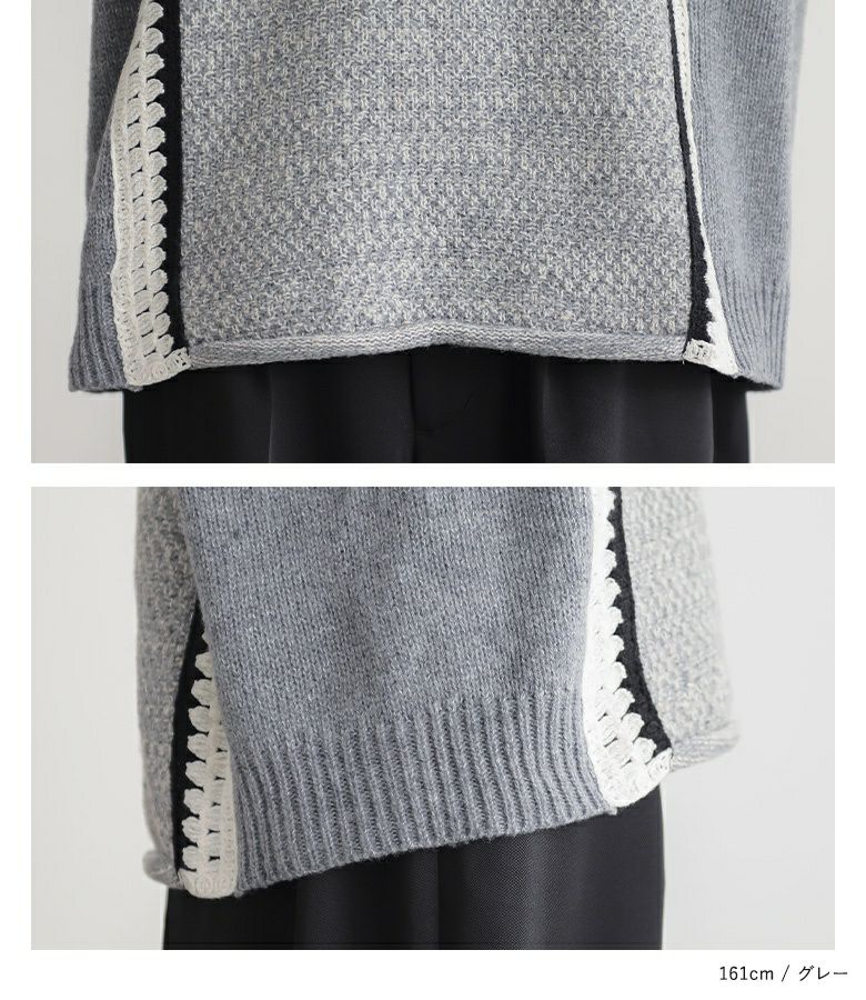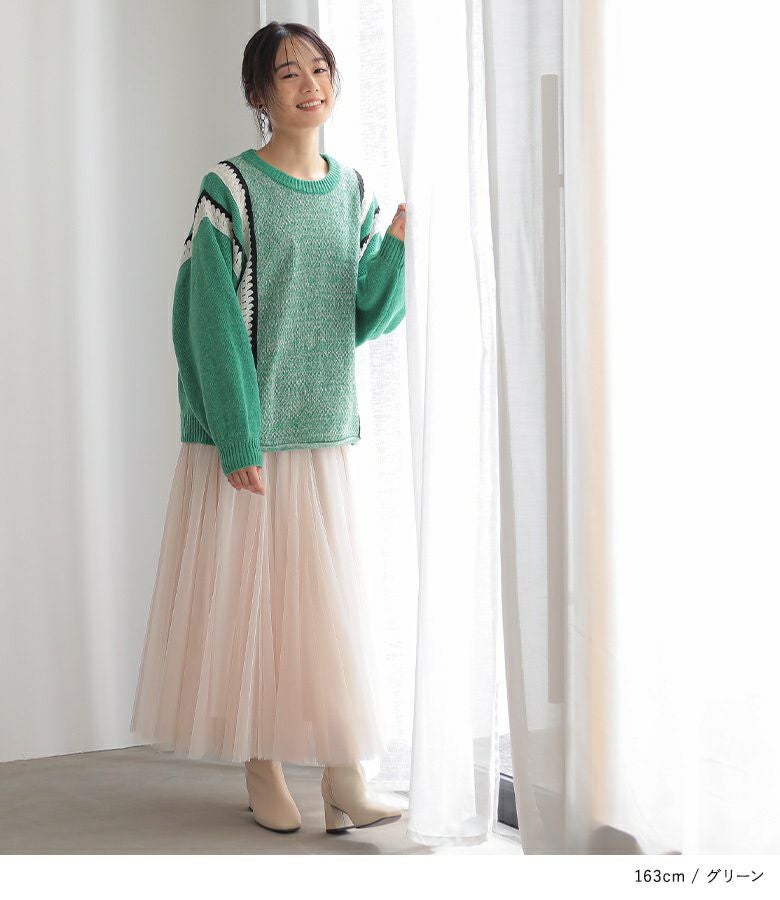 クロシェ編みの配色切替がポイントのぽわん袖ニットトップス。