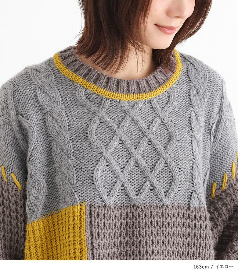 様々な柄を組み合わせたパッチワークデザインのケーブルニット。