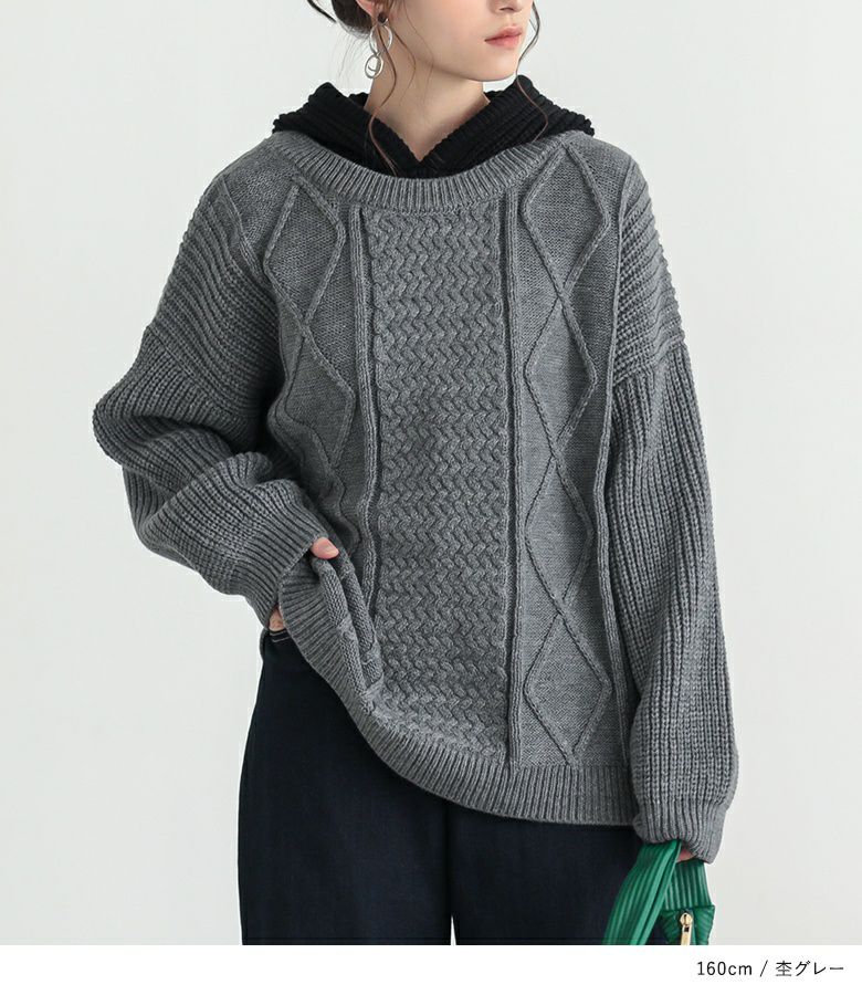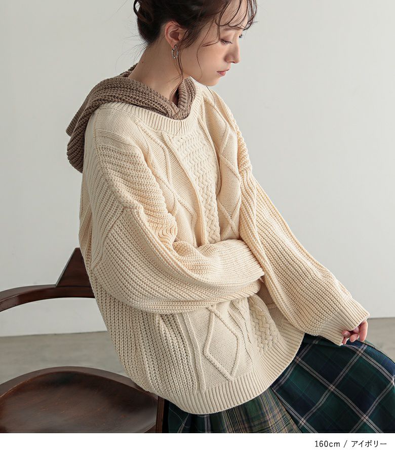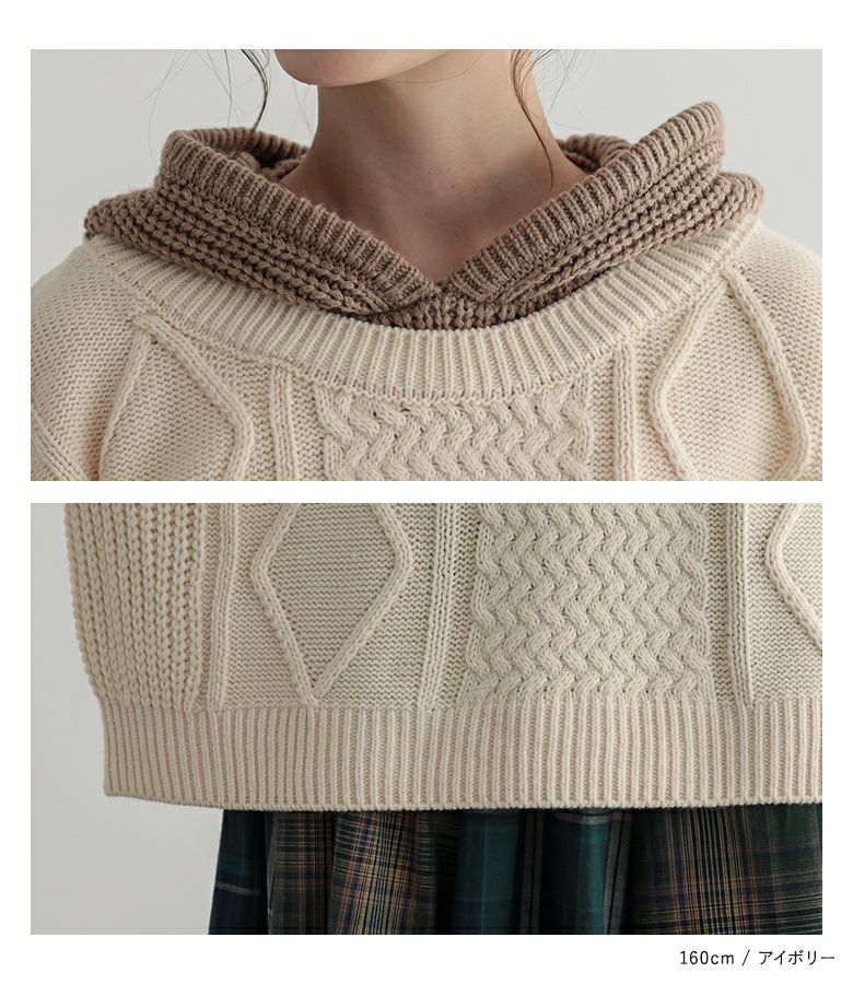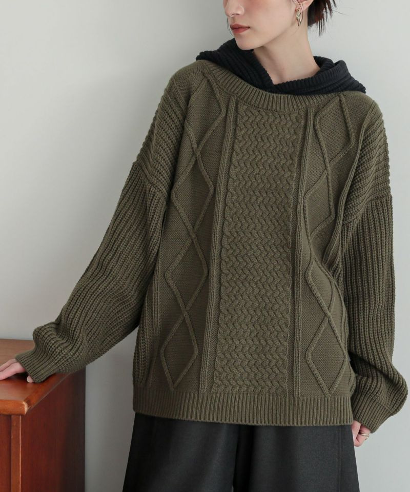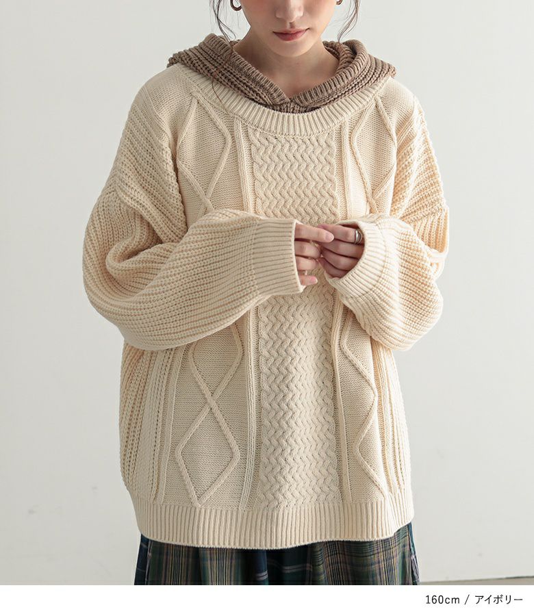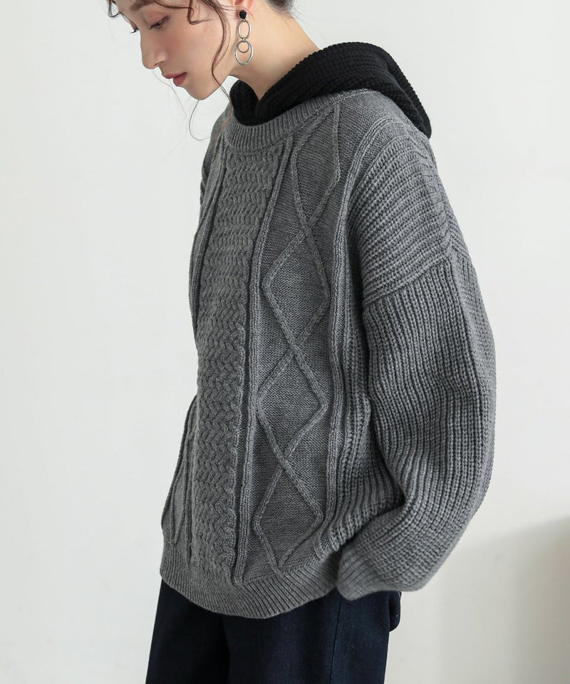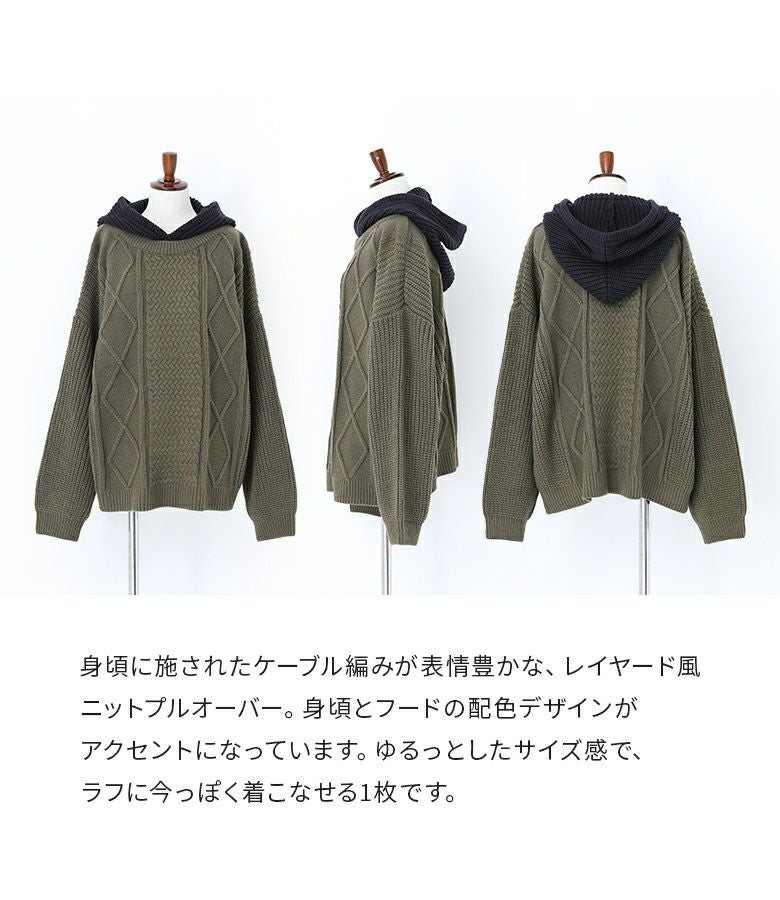 ケーブル編みが表情豊かなレイヤード風のフード付きニットプルオーバー。