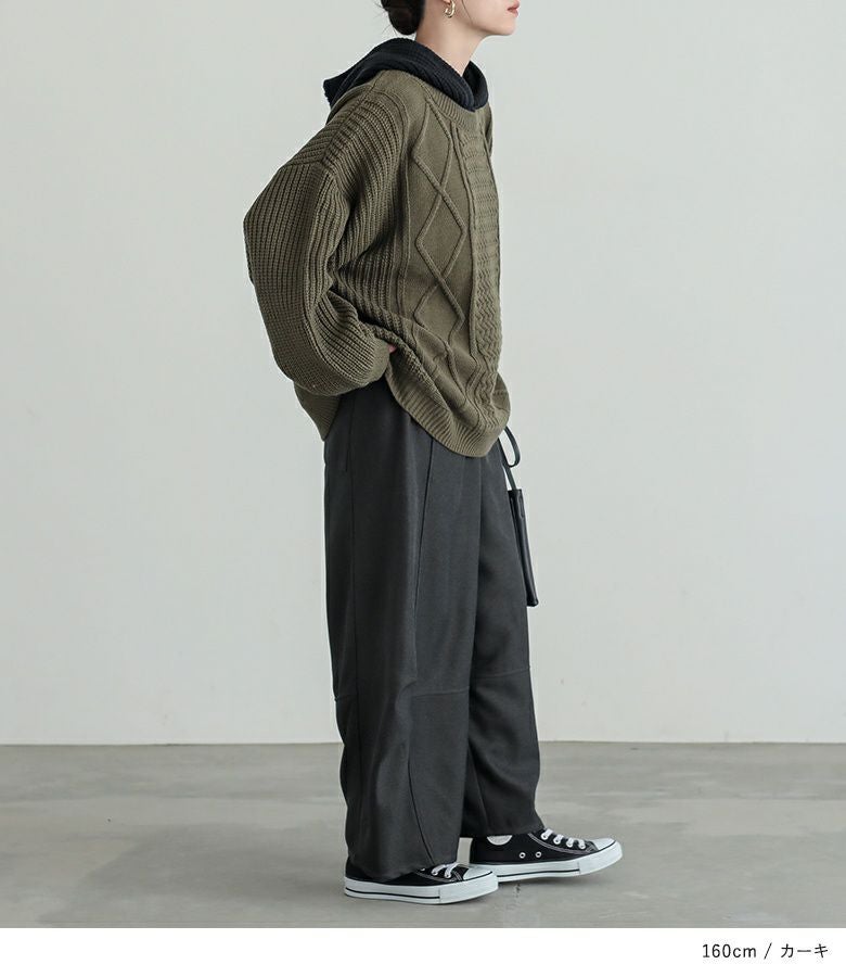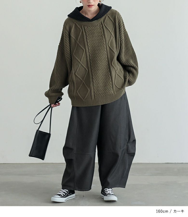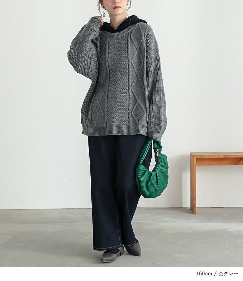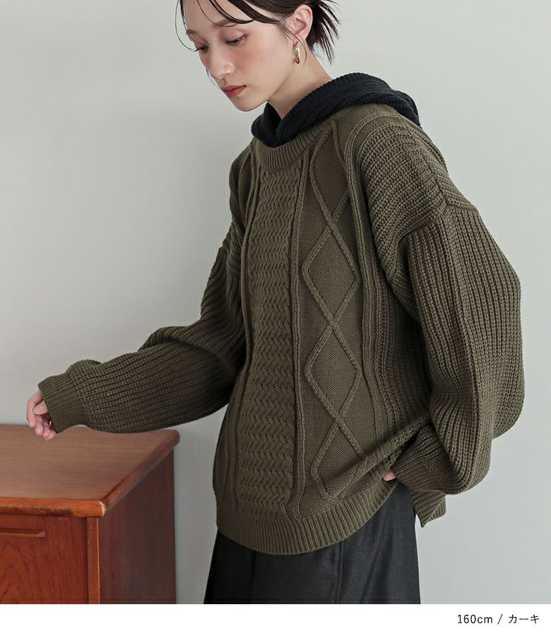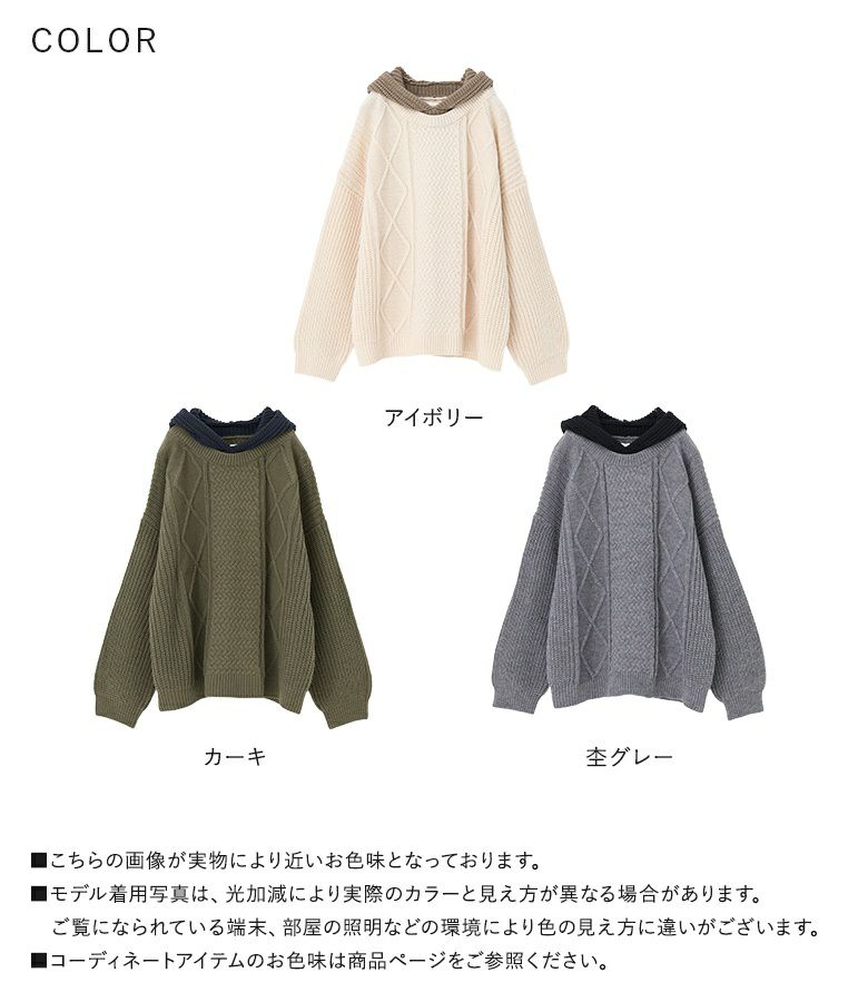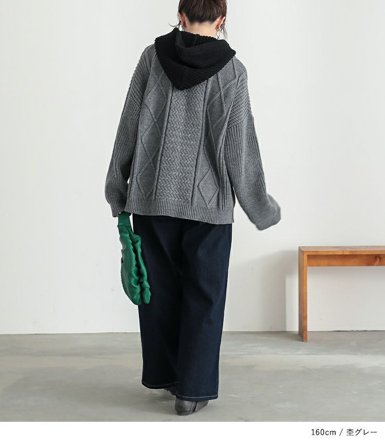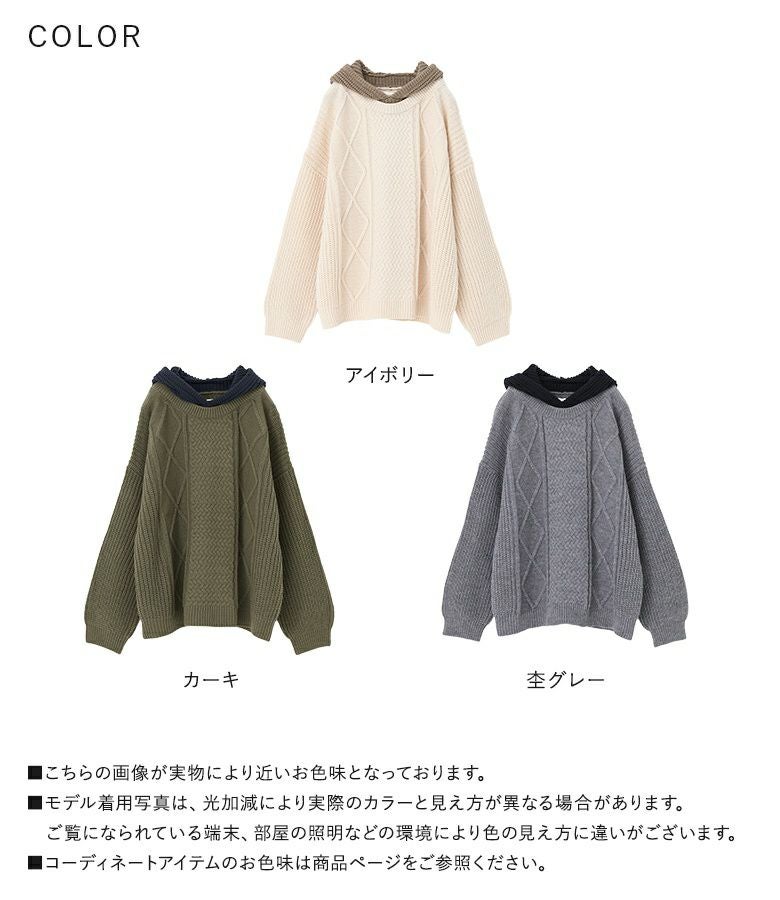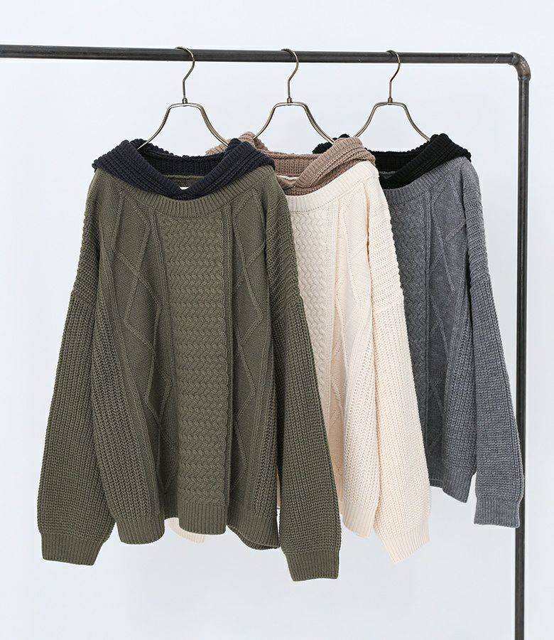 ケーブル編みが表情豊かなレイヤード風のフード付きニットプルオーバー。