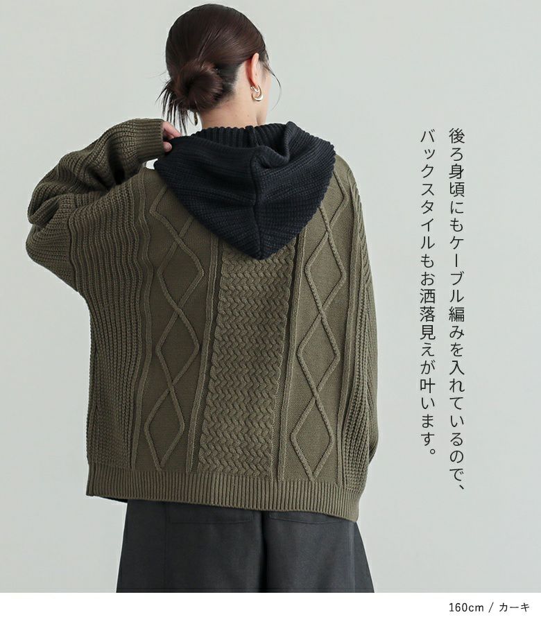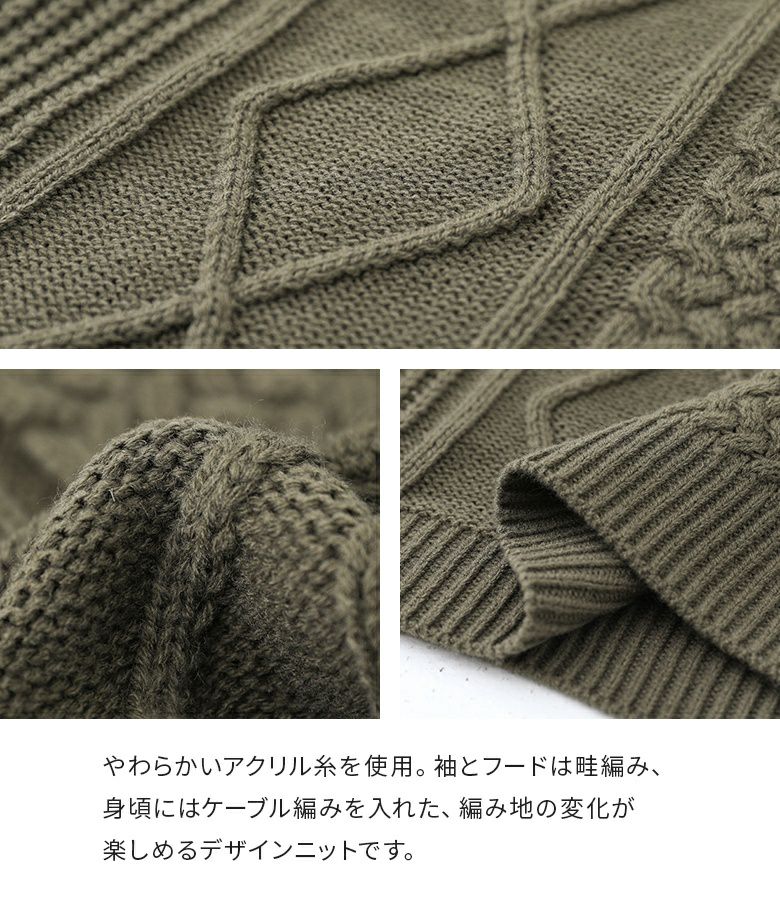 とても柔らかく 太って見えない作りになっています。 ケーブルニットはお気に入りです。 フードのついてないアイボリー・ボルドーとかもあればいいなと思います。