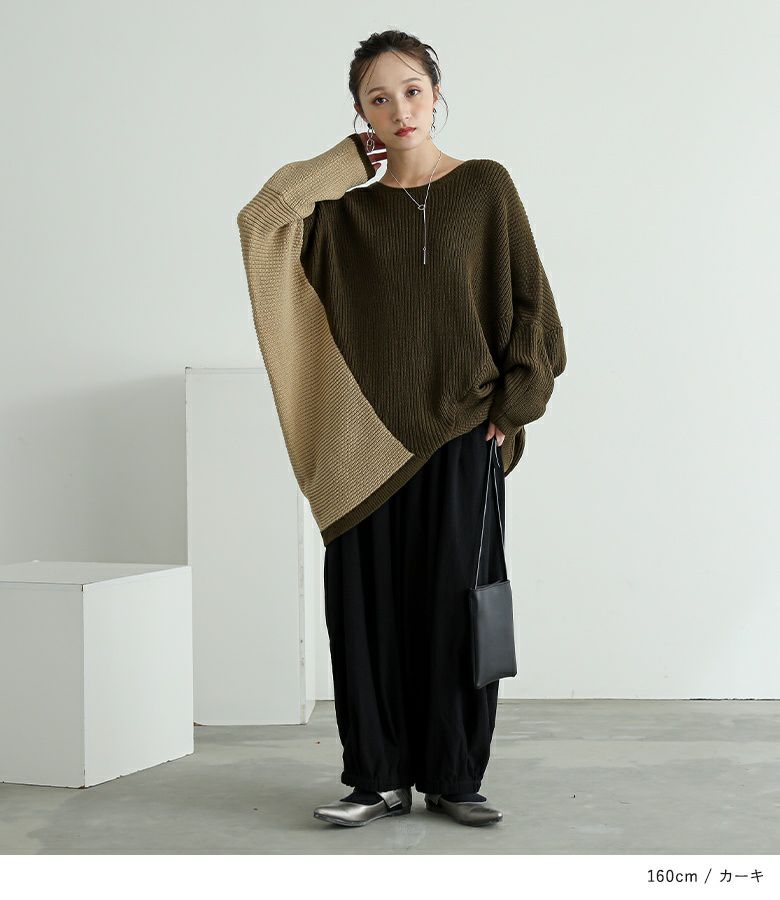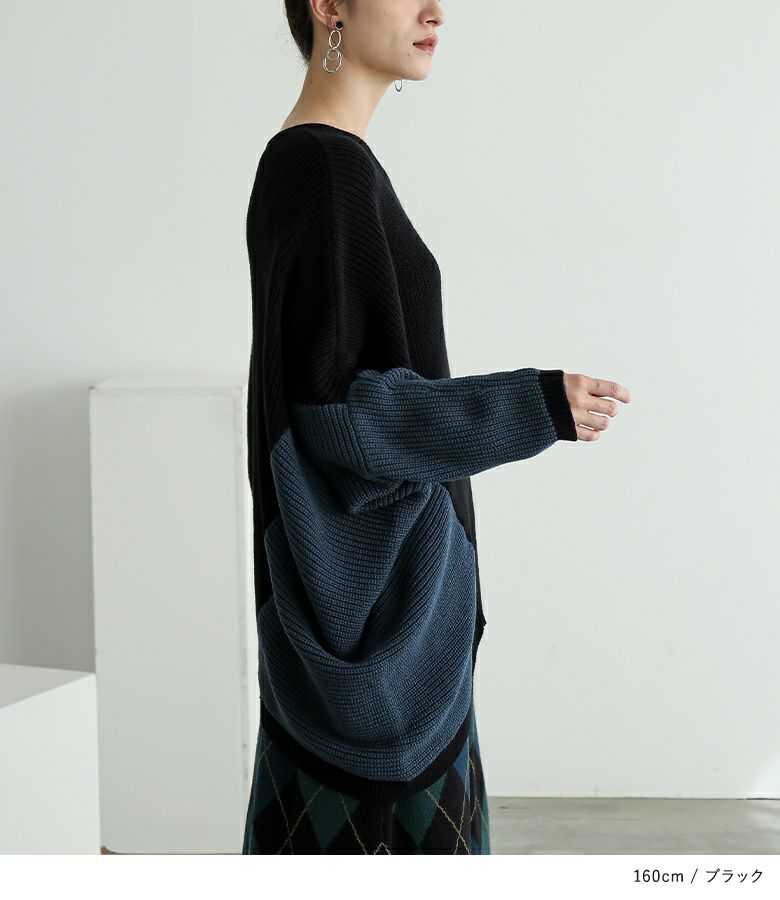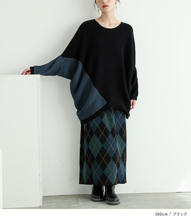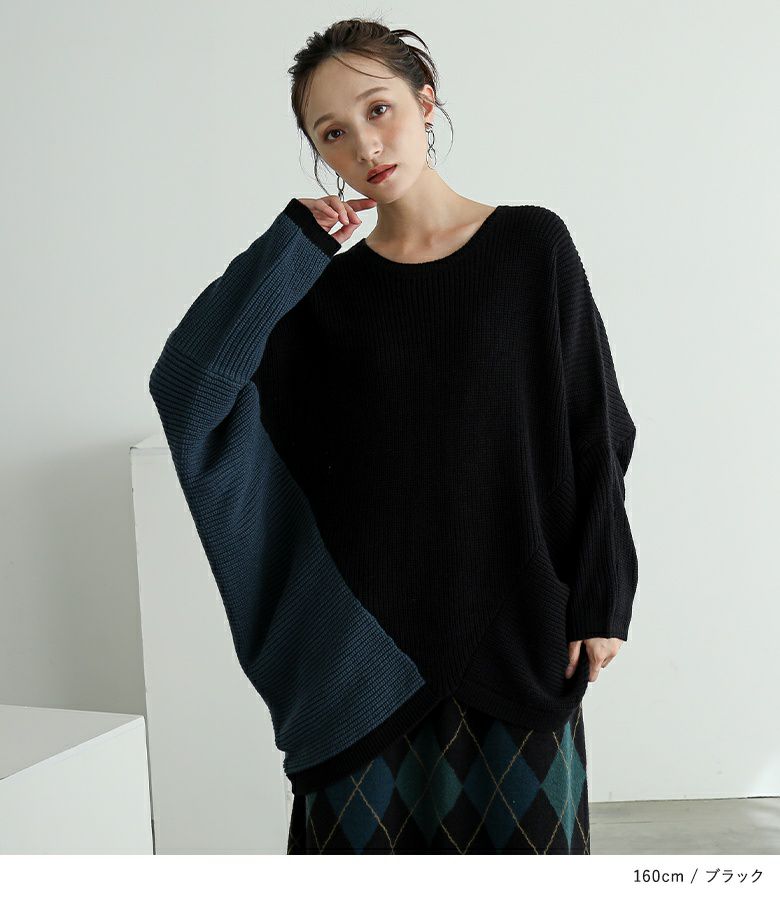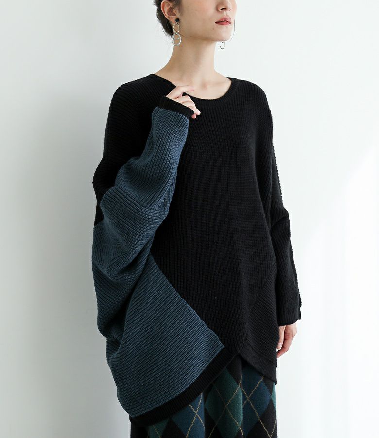 アシンメトリーな配色がコーディネートのアクセントになるニット。