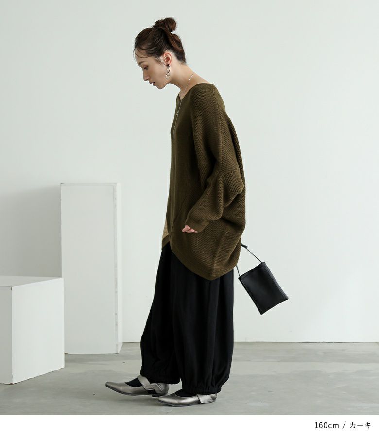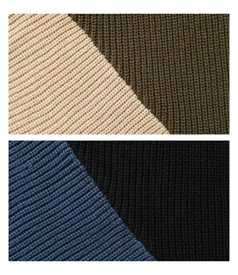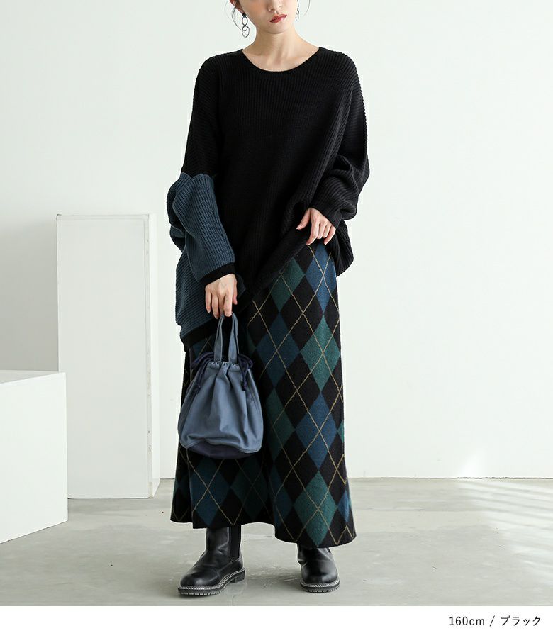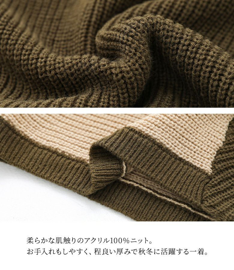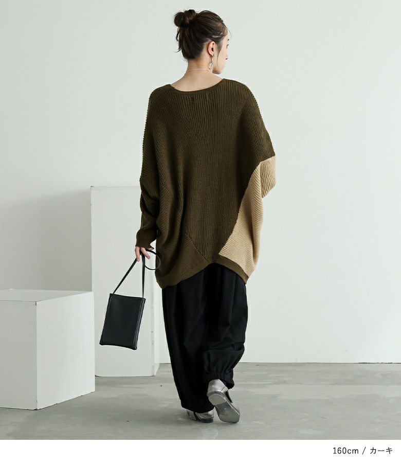 アシンメトリーな配色がコーディネートのアクセントになるニット。