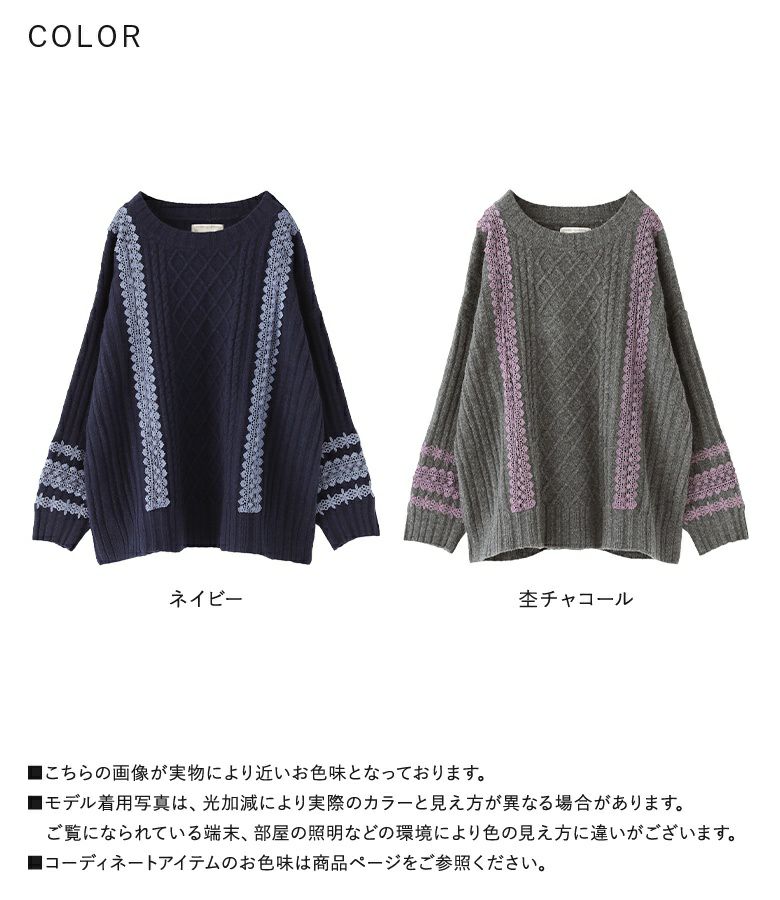 レースデザインモヘヤタッチケーブルニット。配色のレーステープを身頃と袖にあしらって雰囲気のあるデザインニットに仕立てました。ケーブル編みとリブ編みで表情のある編地にしモヘヤタッチの糸を使用しているので柔らかで暖かな着心地まで叶えた一着です。