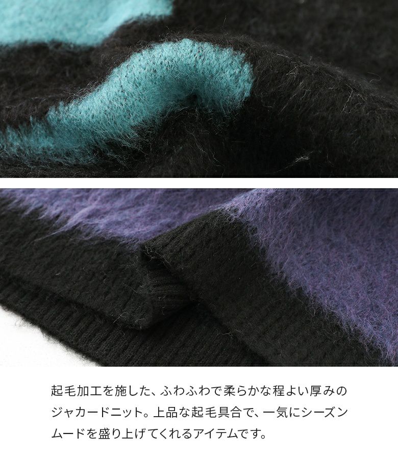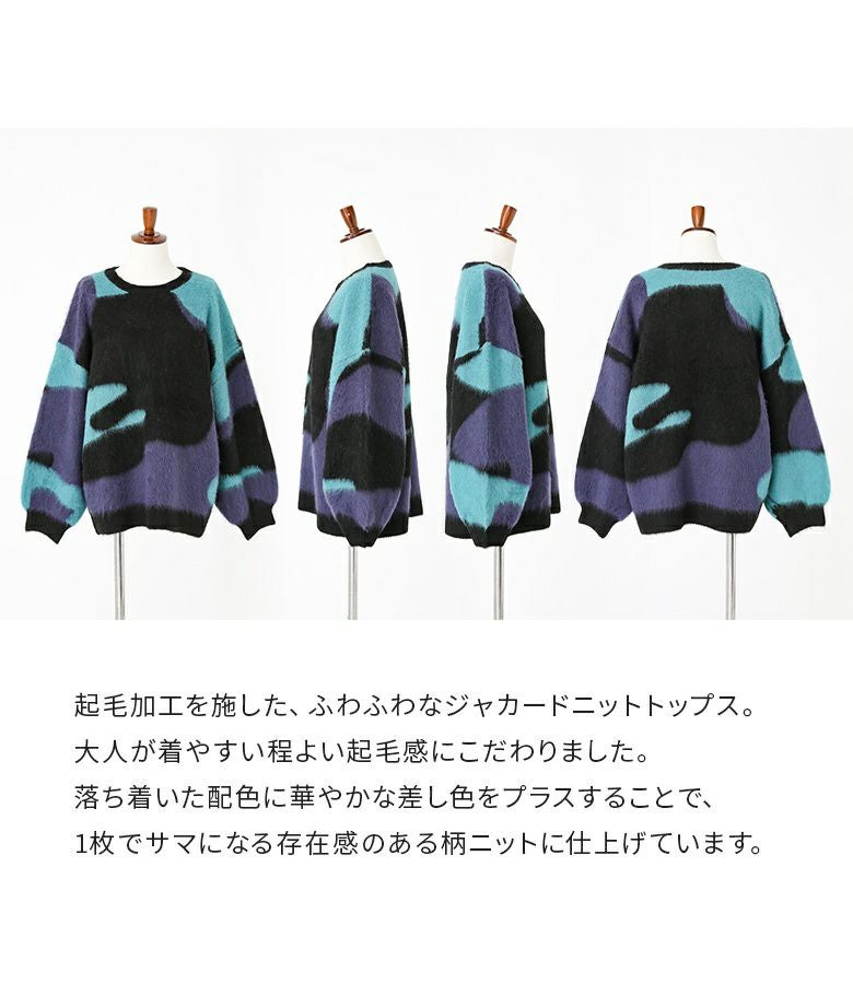 起毛加工を施した、ふわふわなジャカードニットトップス。