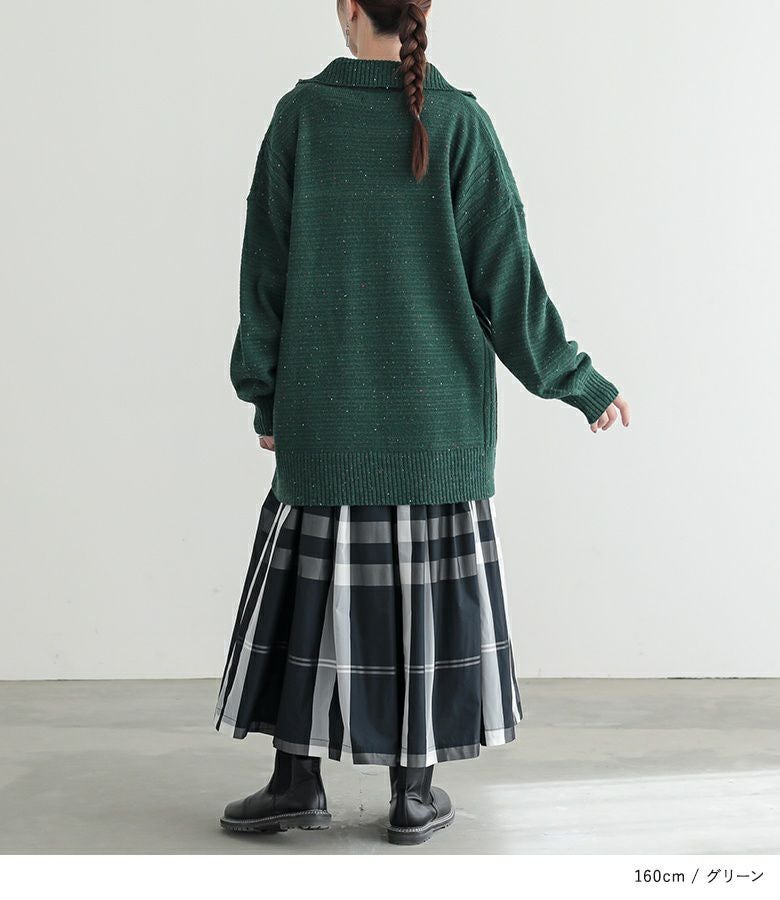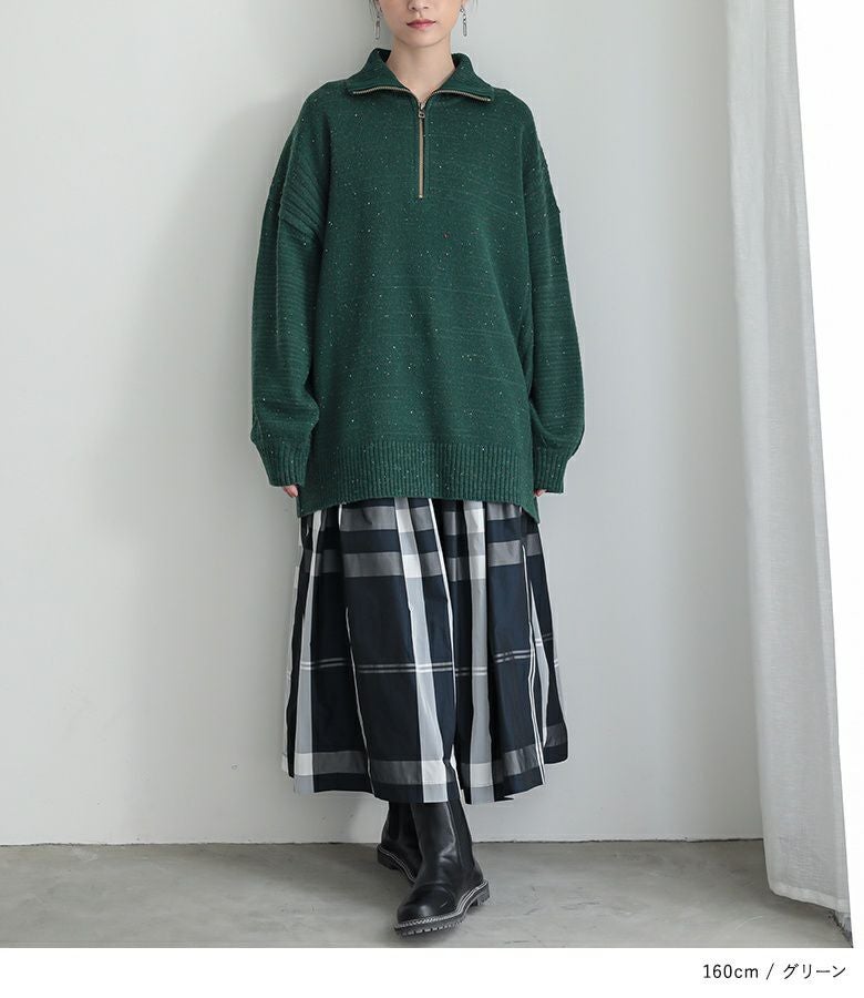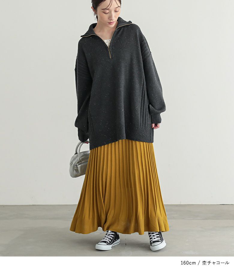 ゆったりシルエットですが、襟元がジップのデザインですっきり見えします。丈感が長めのトップスですので気になるウエスト周りをすっぽりと隠してくれます。