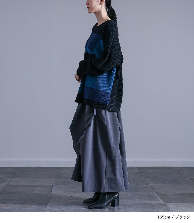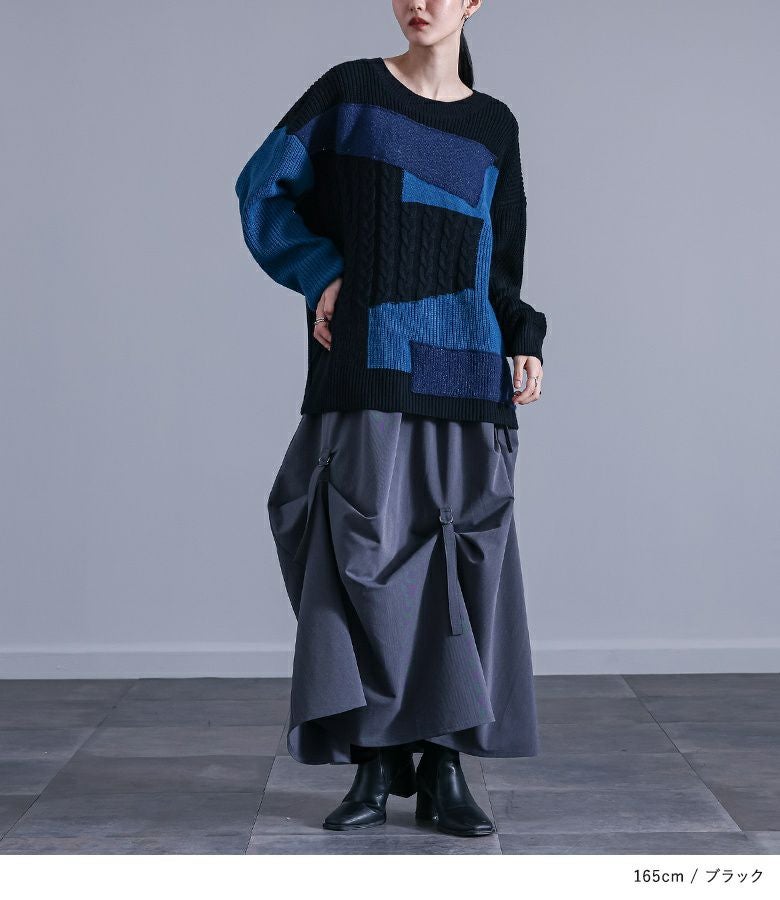 パッチワーク風のデザイン性が高いニットなので、シンプルなトップスに合わせるだけで個性的な着こなしが完成します。パンツ・スカートどちらにも合わせやすく、モードなスタイリングから、デニム合わせなどのカジュアルな着こなしまで、幅広く着回せる一枚です。