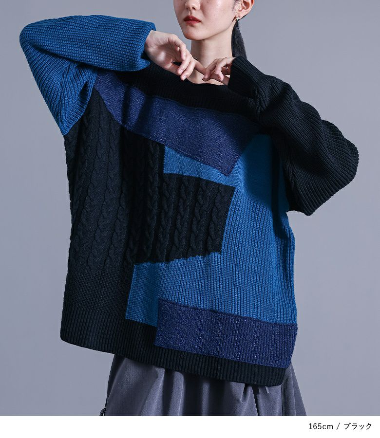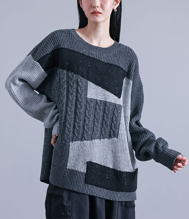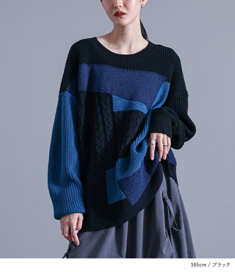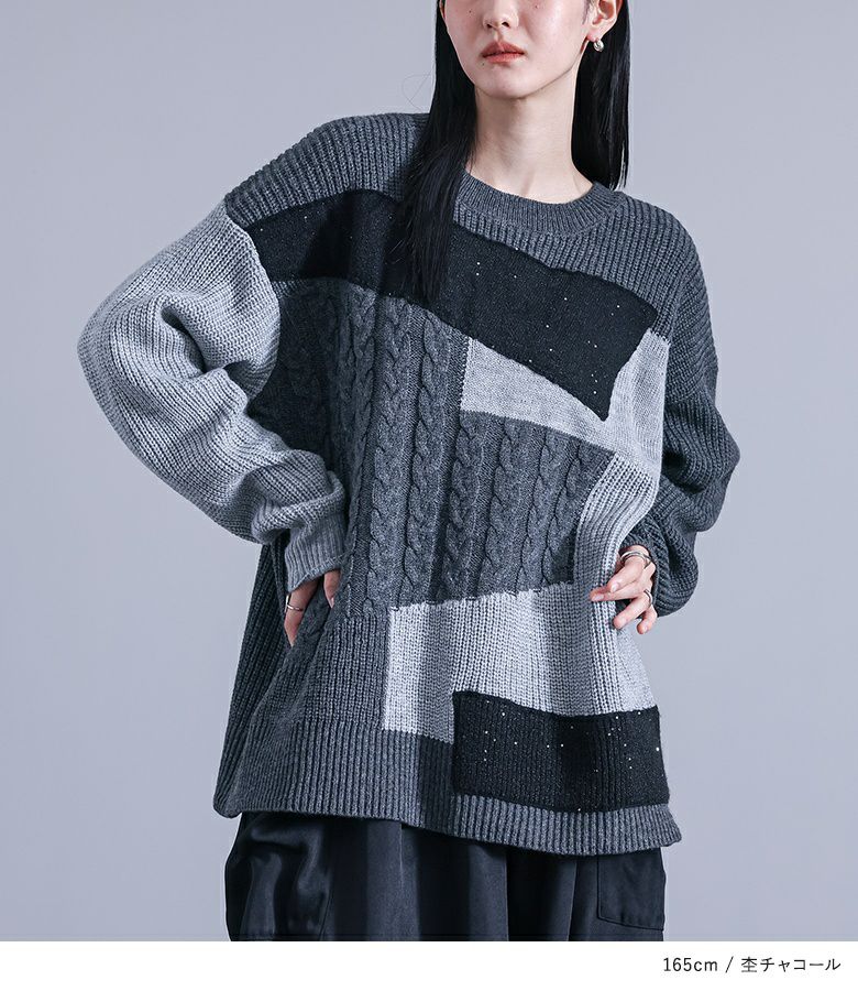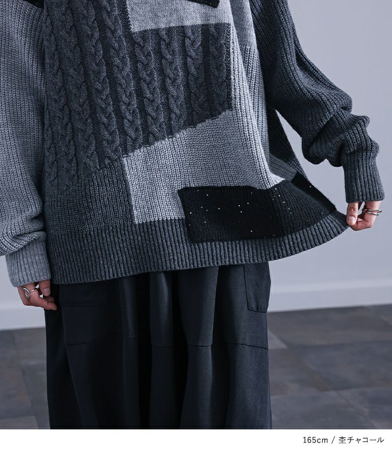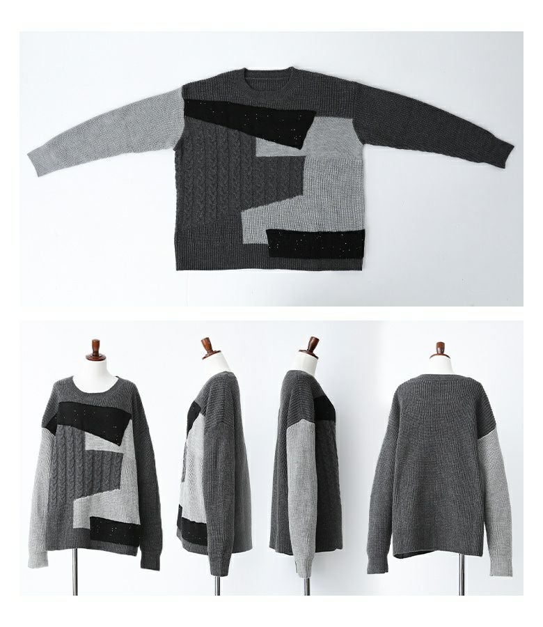 ニット生地や編み地を変えてパッチワーク風にしたデザインニット。