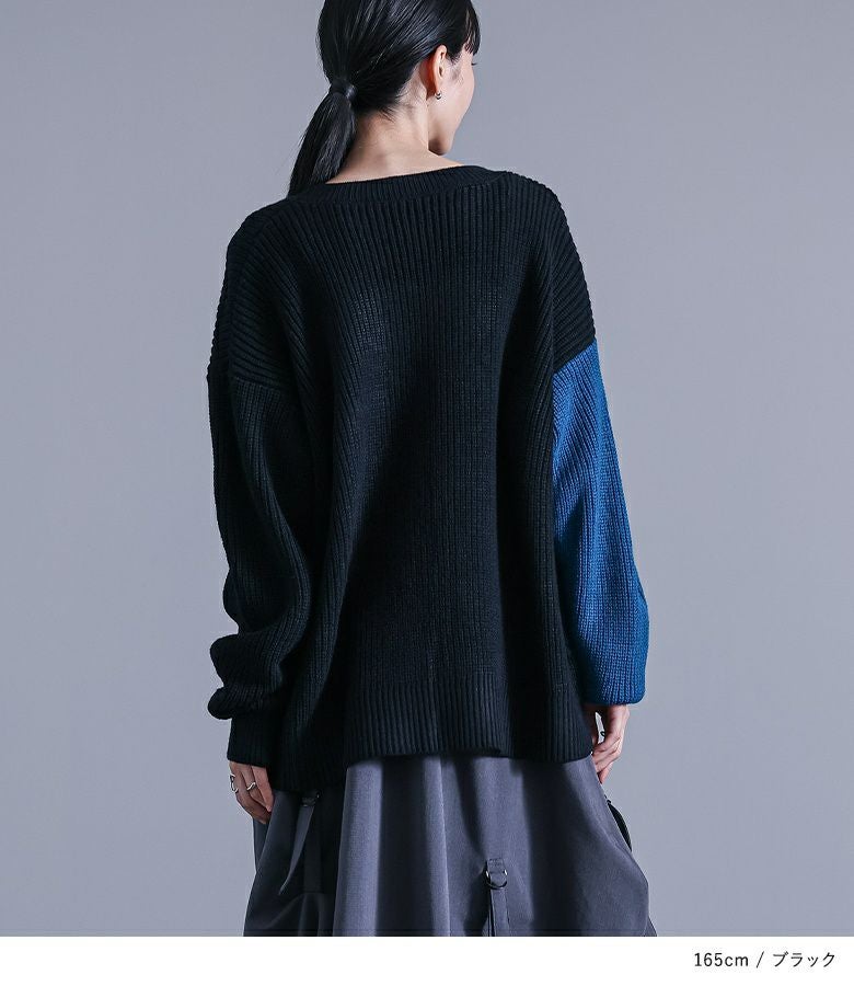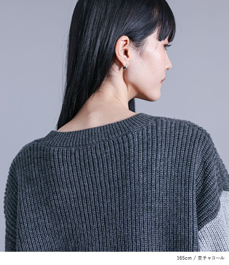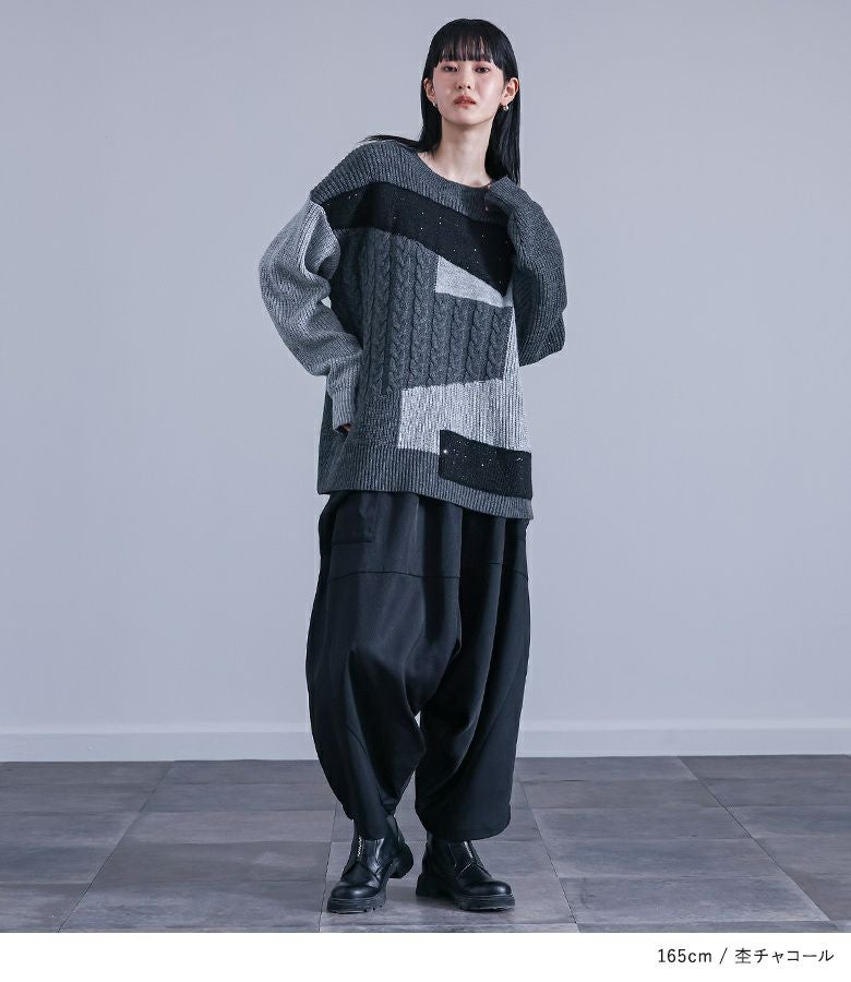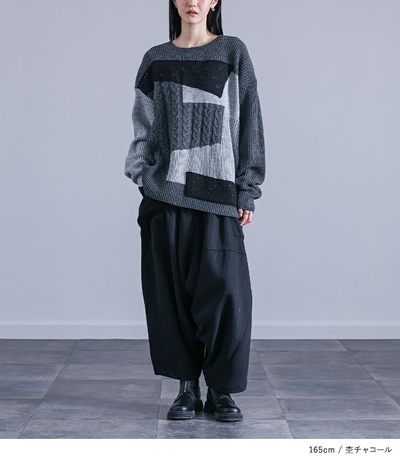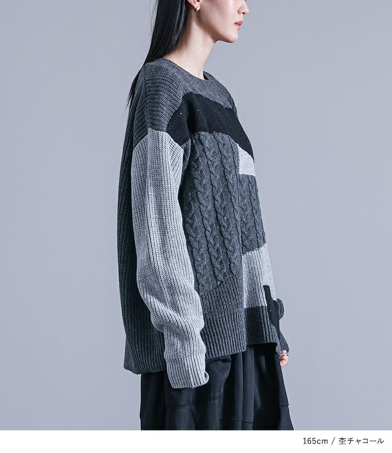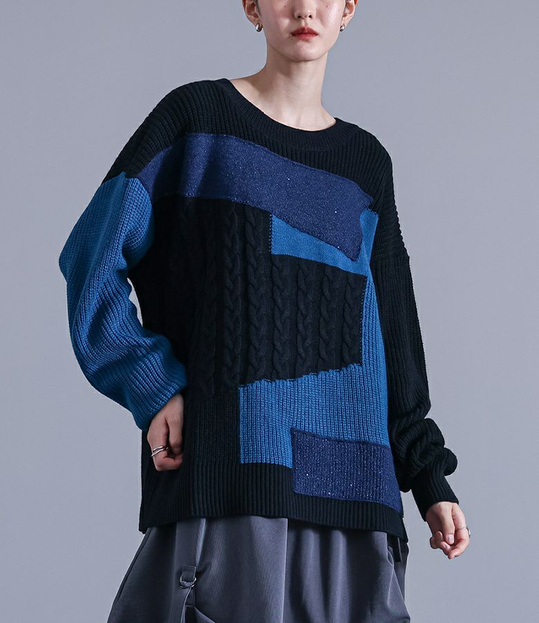 ニット生地や編み地を変えてパッチワーク風にしたデザインニット。