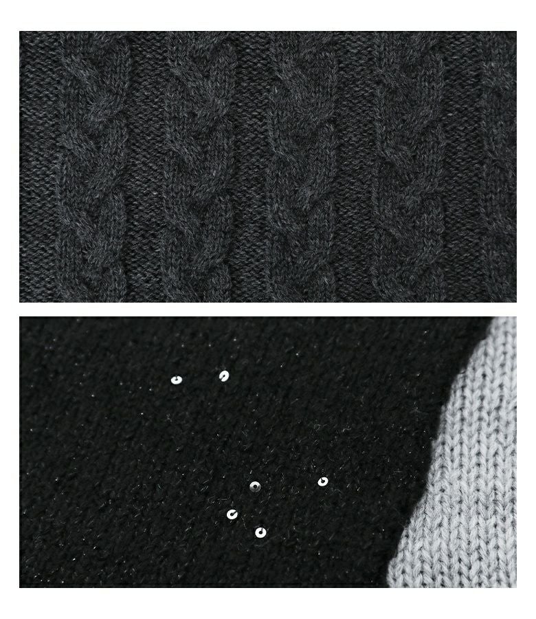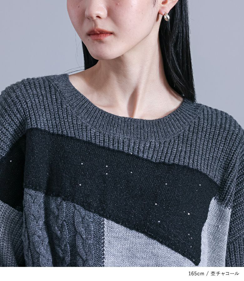 ニット生地や編み地を変えてパッチワーク風にしたデザインニット。天竺編み・片畦編み・ケーブル編みの3種類を使用し、表情豊かなニットに仕上げました。スパンコール入りのラメ糸を使ったニットは、肌刺激がないようにニットの上にあしらい、肌に直接触れないようにしました。