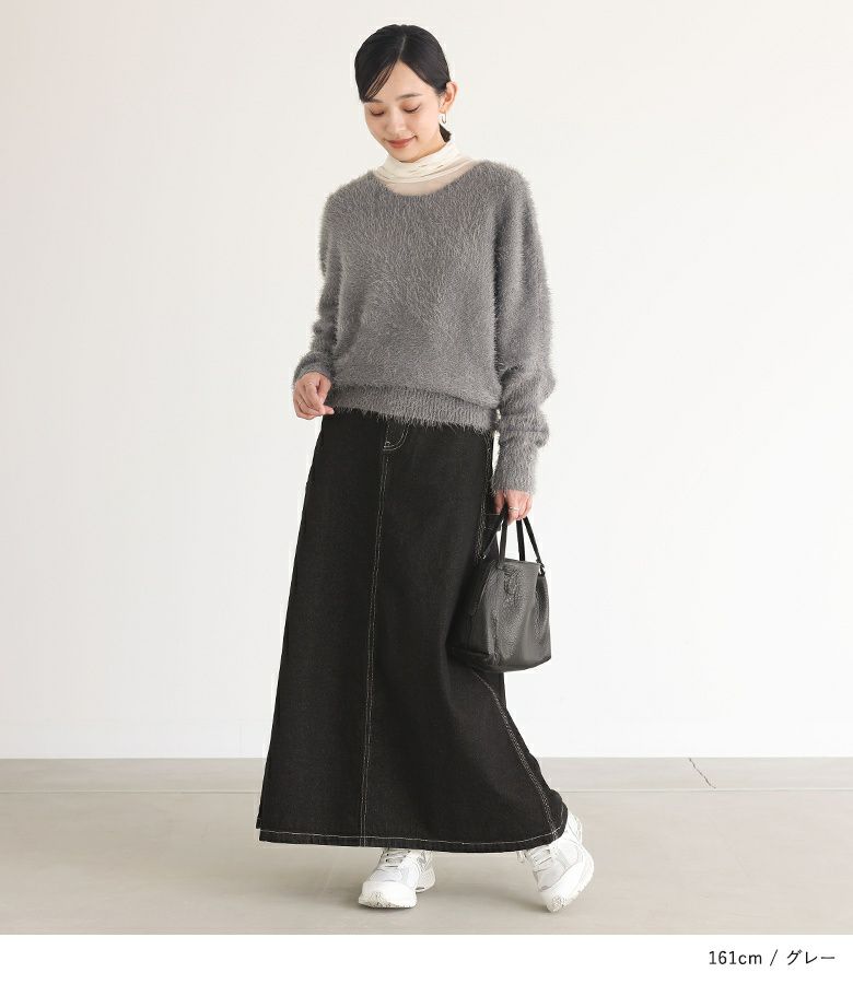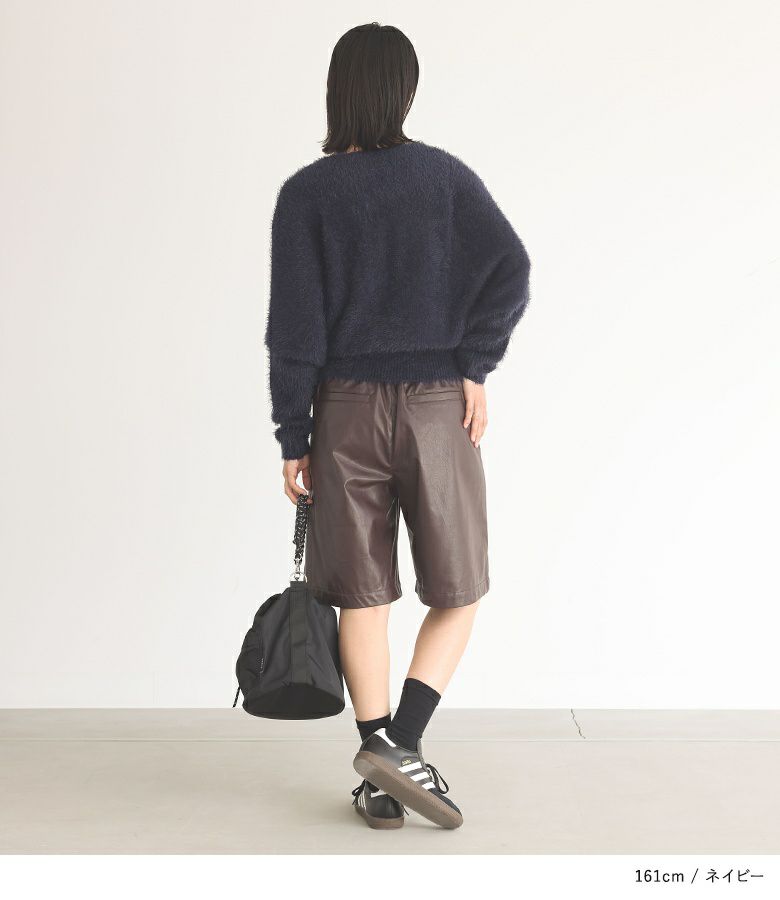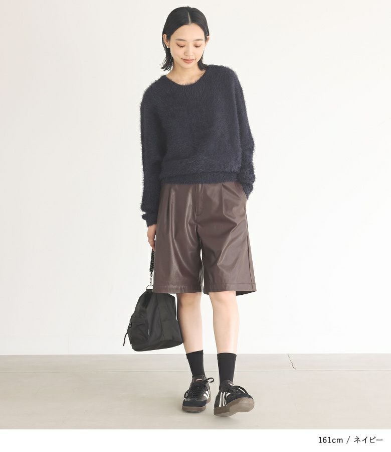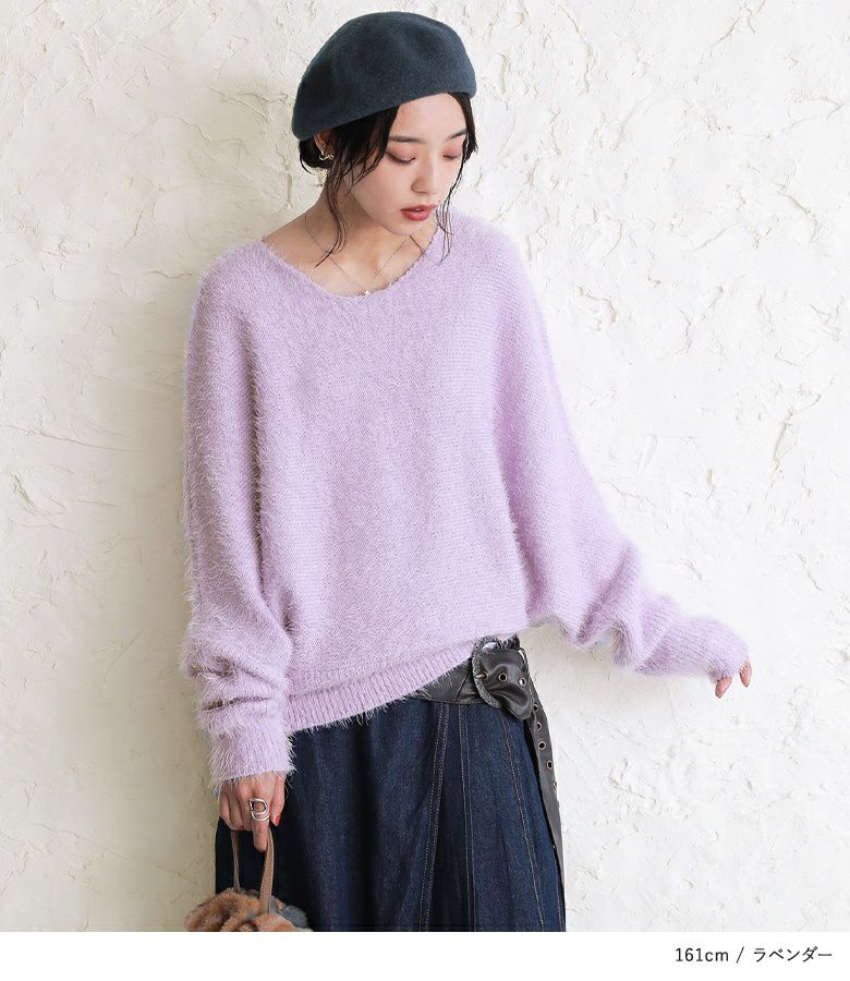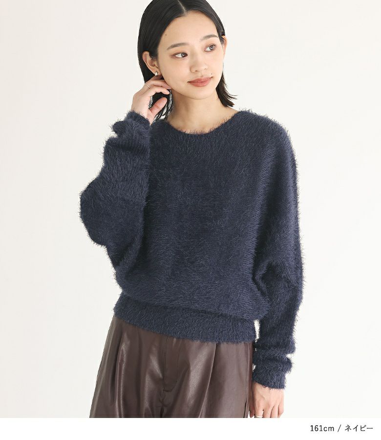 柔らかくふわふわした肌触りが魅力的な毛足の長いシャギーニット。思わず触れたくなる心地良さです。