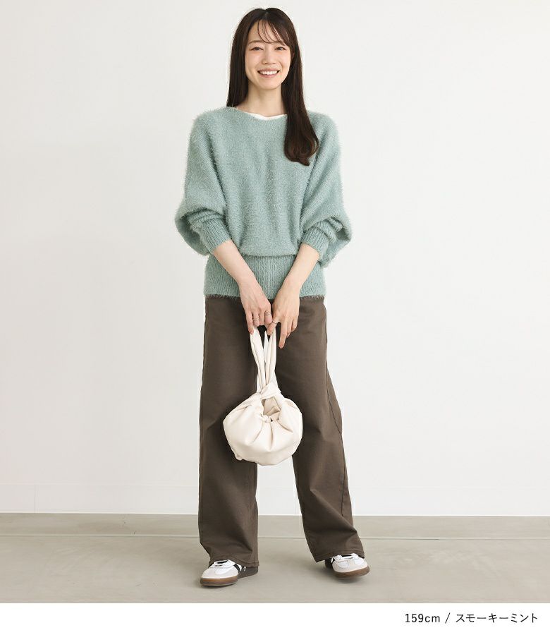 ふわふわとした心地良い肌触りと、ラフに着用できるゆるっとしたシルエットがお洒落なシャギーニット。スカートにもパンツにも合わせやすい丈感に、袖と裾はリブ仕立てでメリハリをプラスしました。背面にはタックを入れてすっきりと見えるように工夫しました。