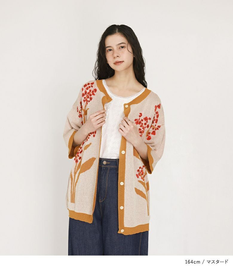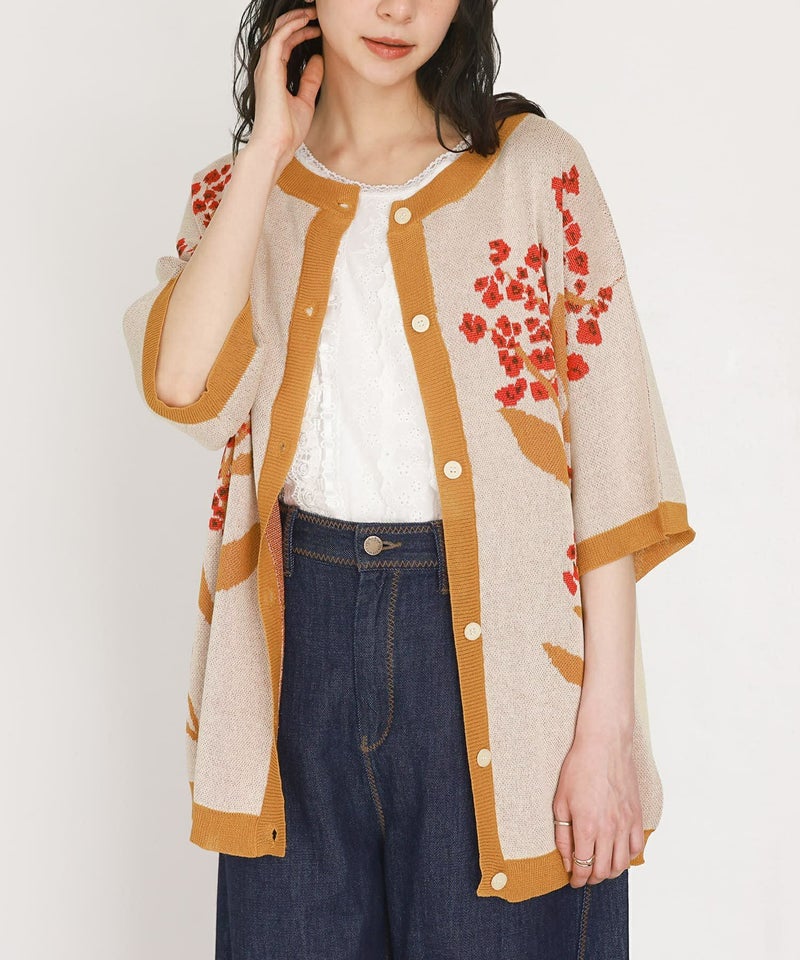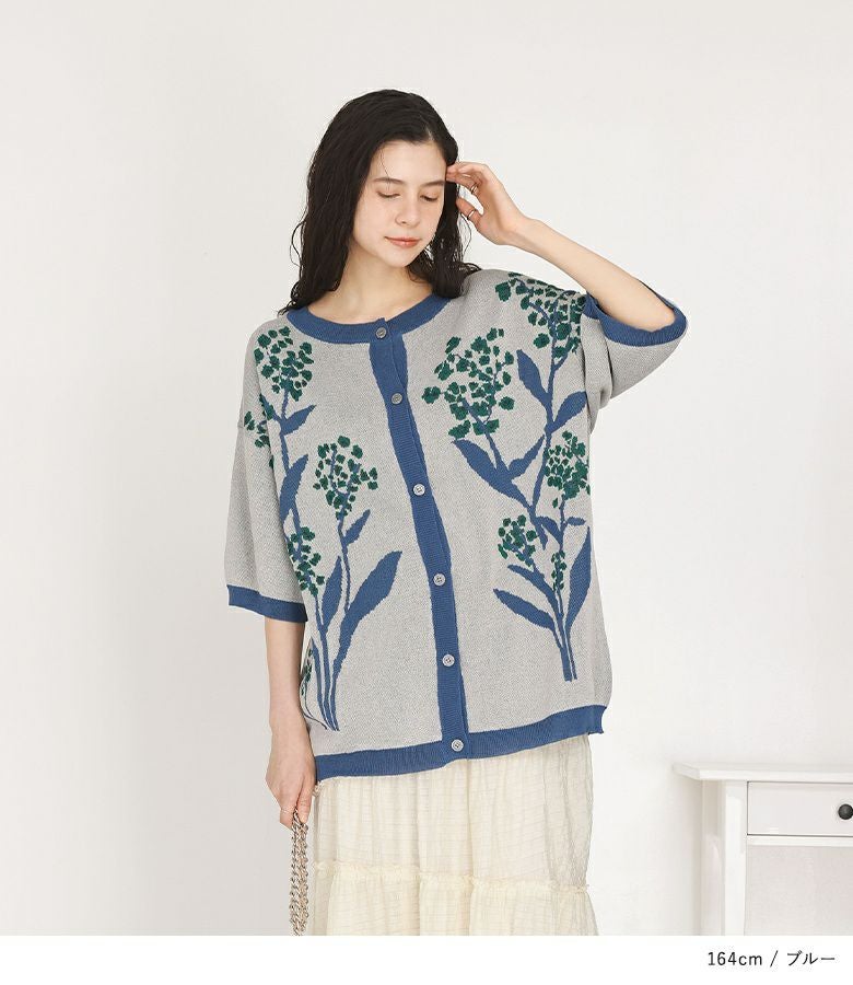 オリジナルの花柄デザインが映えるジャカードニット。配色のリブ切り替えがメリハリのあるデザインです。貝調ボタンが上品な印象の一枚です。