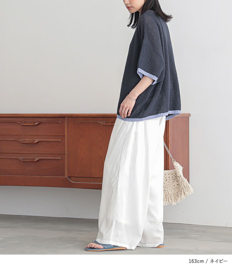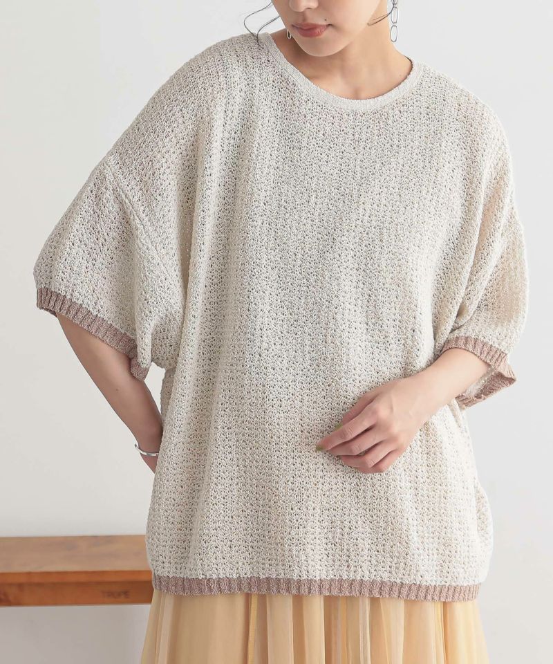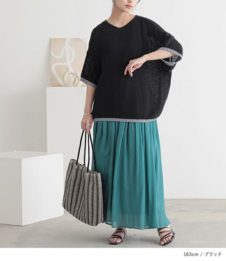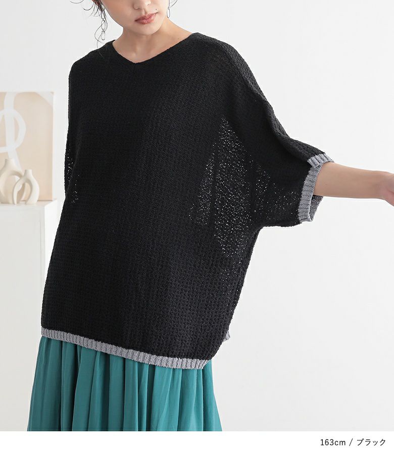 表面感のある透かし編みと配色が映える、体型カバーも期待できるお洒落ニット。