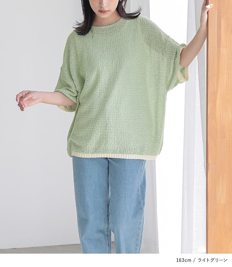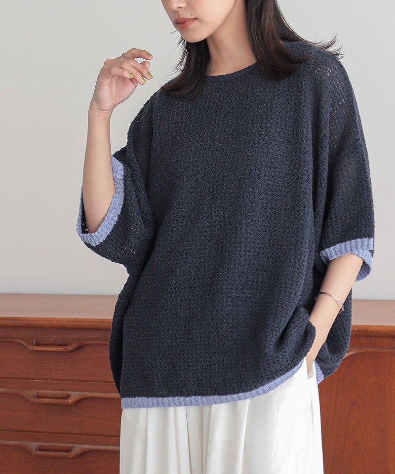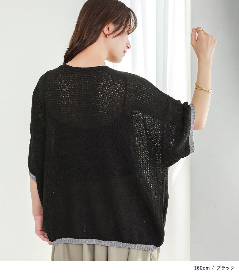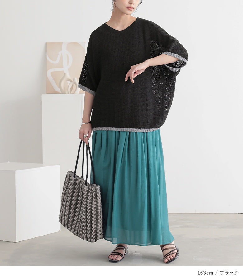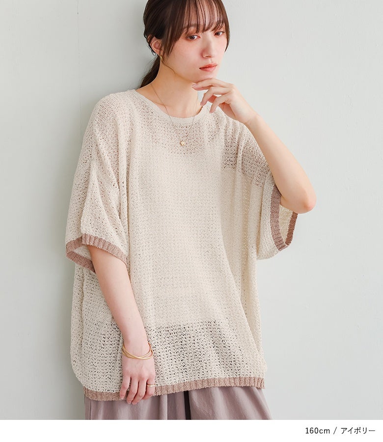 表面感のある透かし編みと配色が映える、体型カバーも期待できるお洒落ニット。