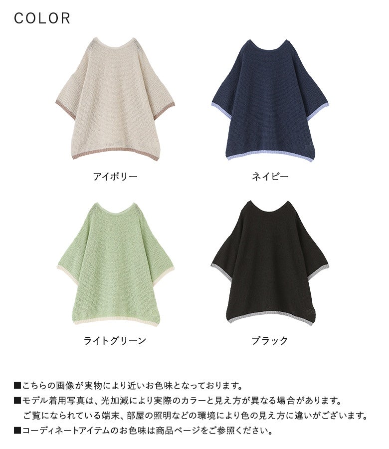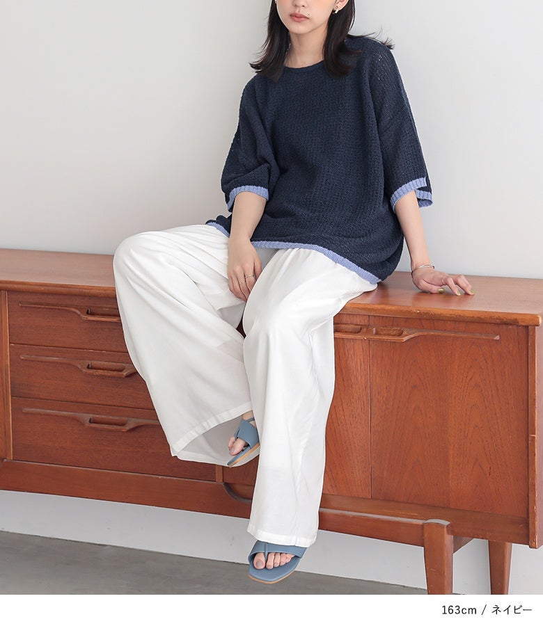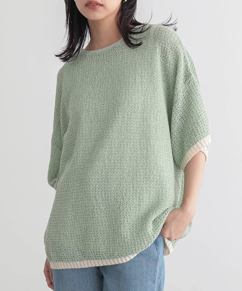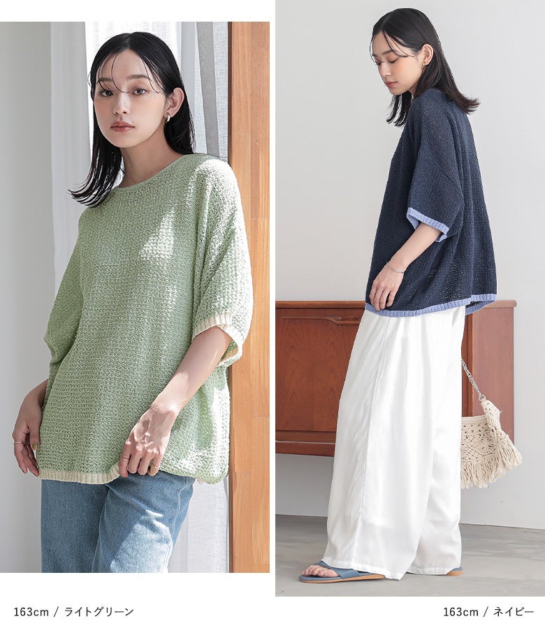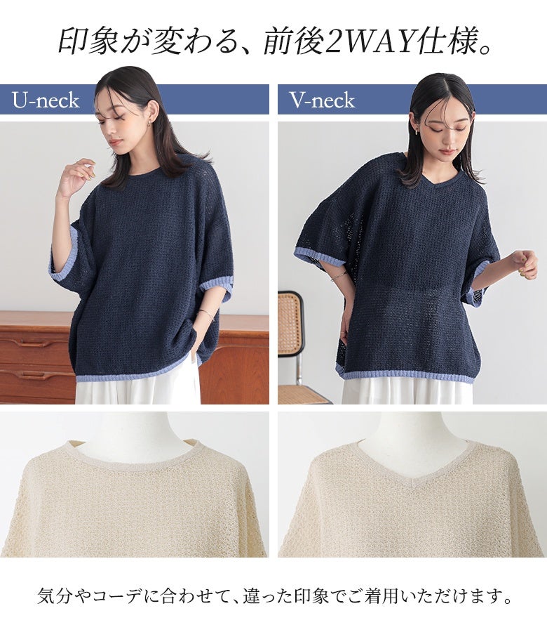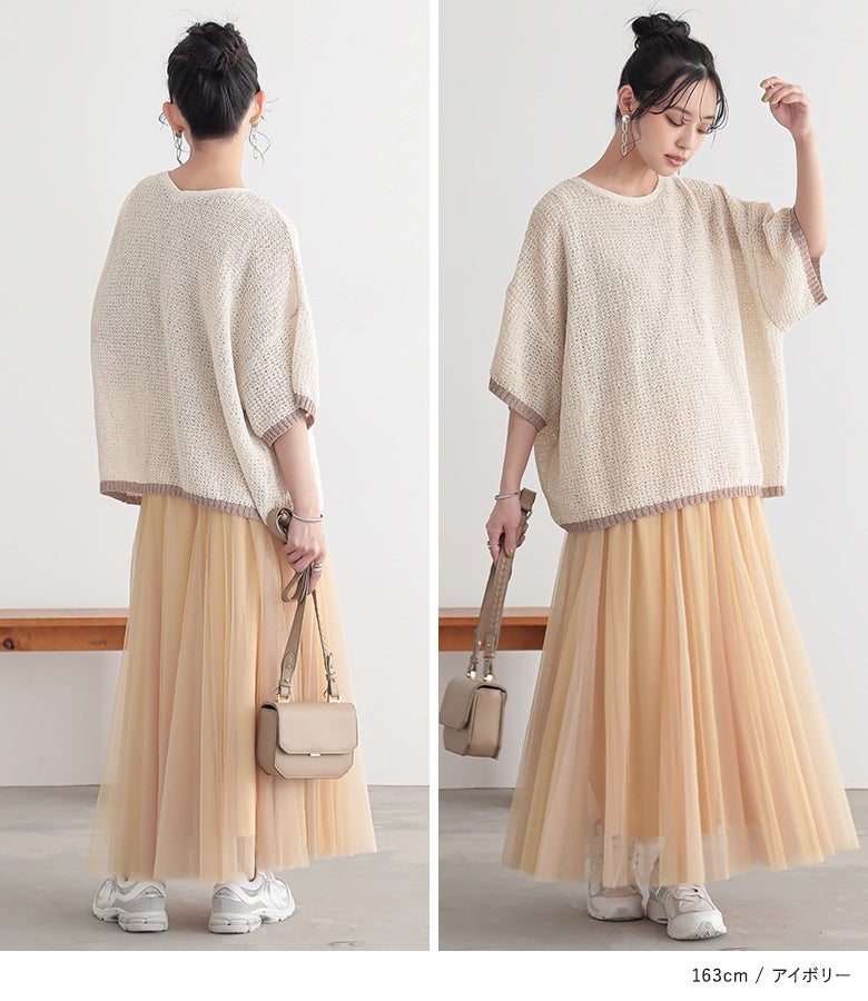 表面感のある透かし編みと配色が映える、体型カバーも期待できるお洒落ニット。