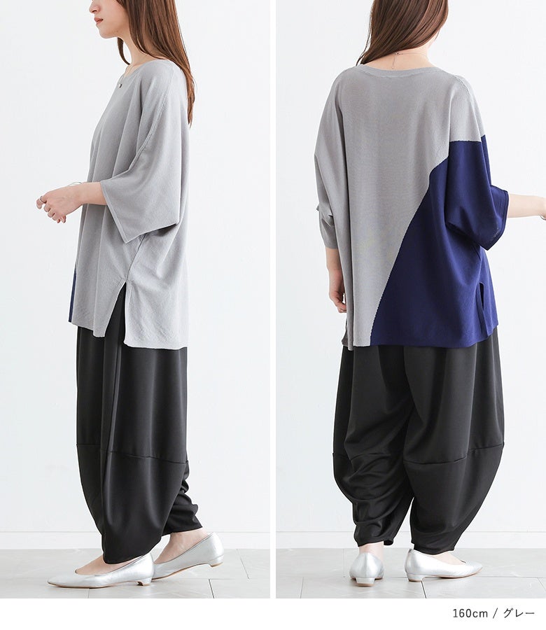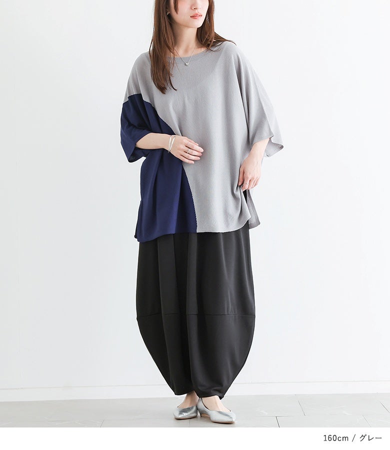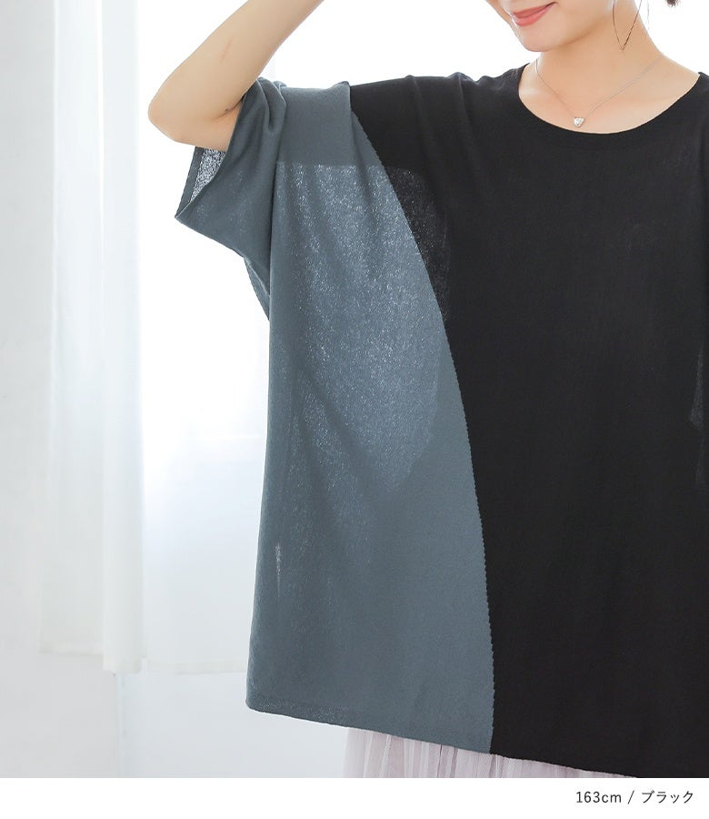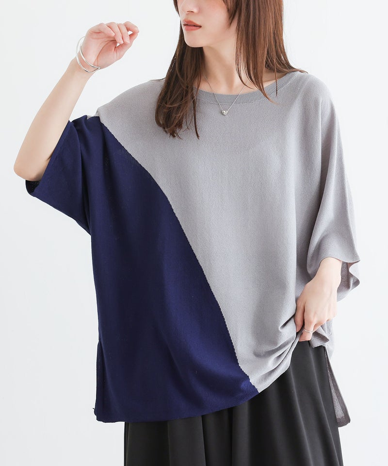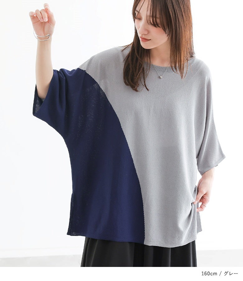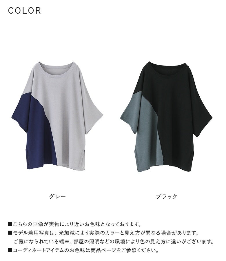 接触冷感生地でひんやりとした肌触りの配色ドルマンニット。