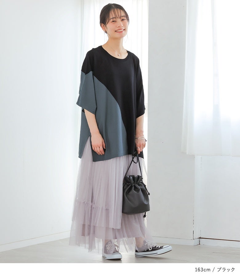 体のラインを拾わず、安心して着られました。気になるお腹まわりや二の腕もカバーしてくれるのが嬉しいポイントです。生地はさらっとしていて肌触りがとても良く、チクチク感もなく快適です。