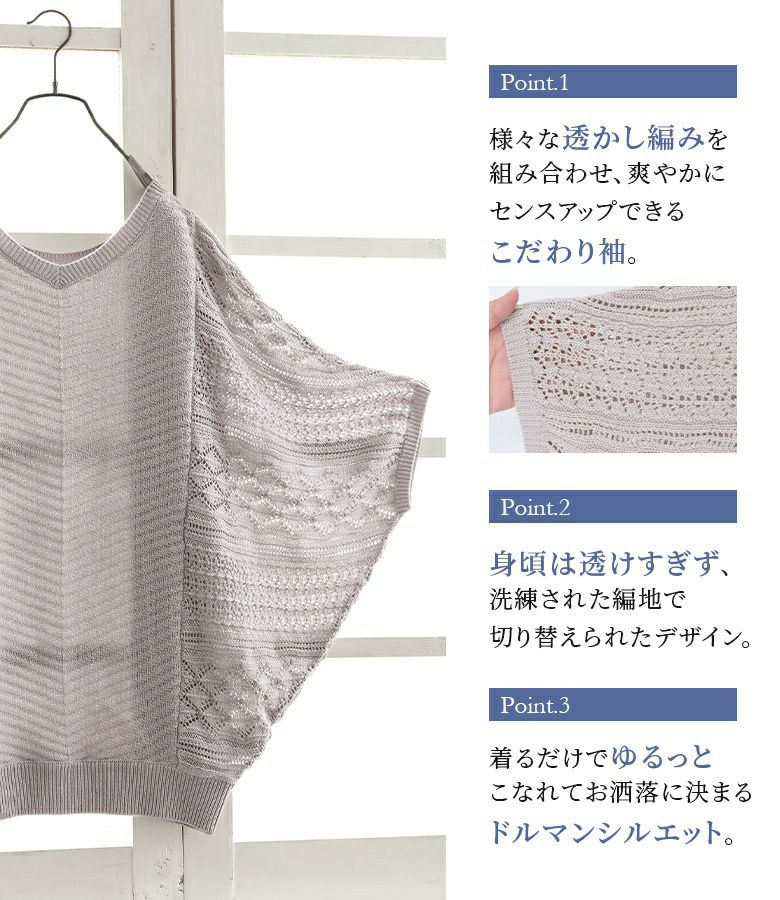 身頃と袖で透け感も柄も異なる、表情豊かな透かし編みに見惚れる。こだわりのゆったりドルマンシルエットがこなれ感を演出します。