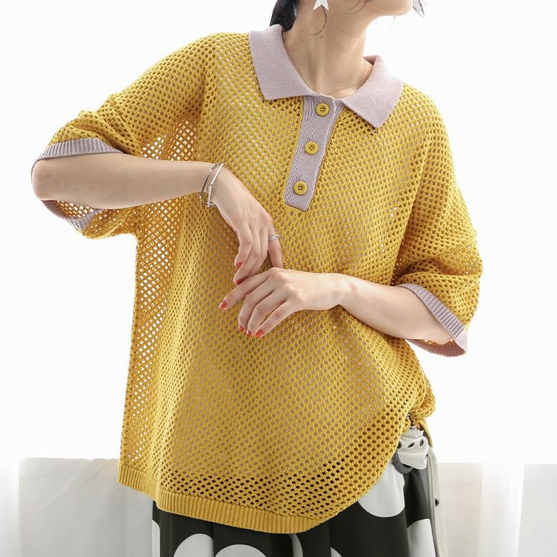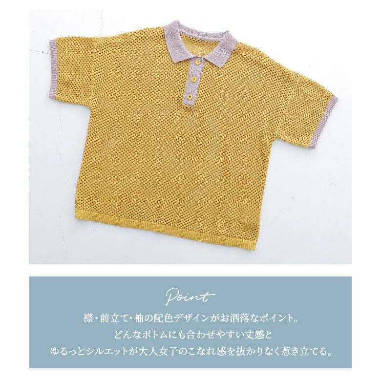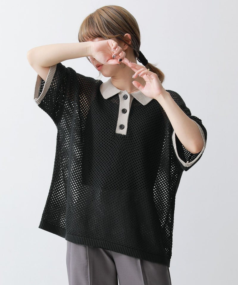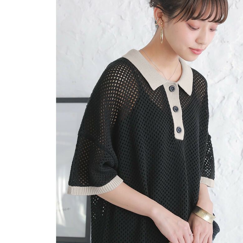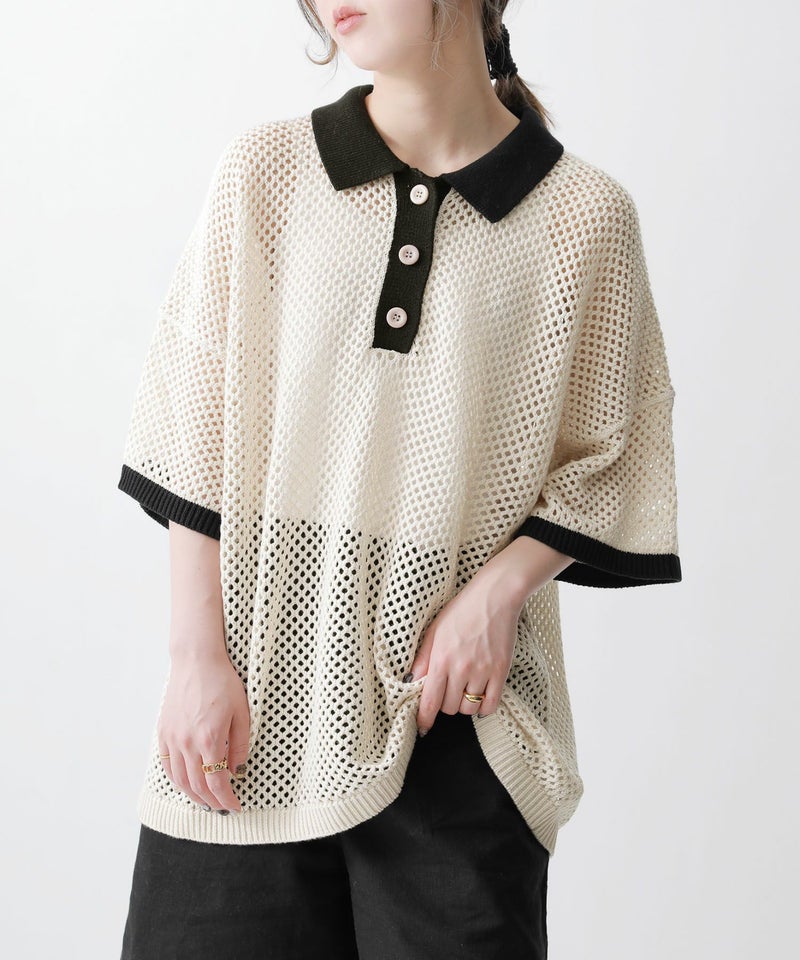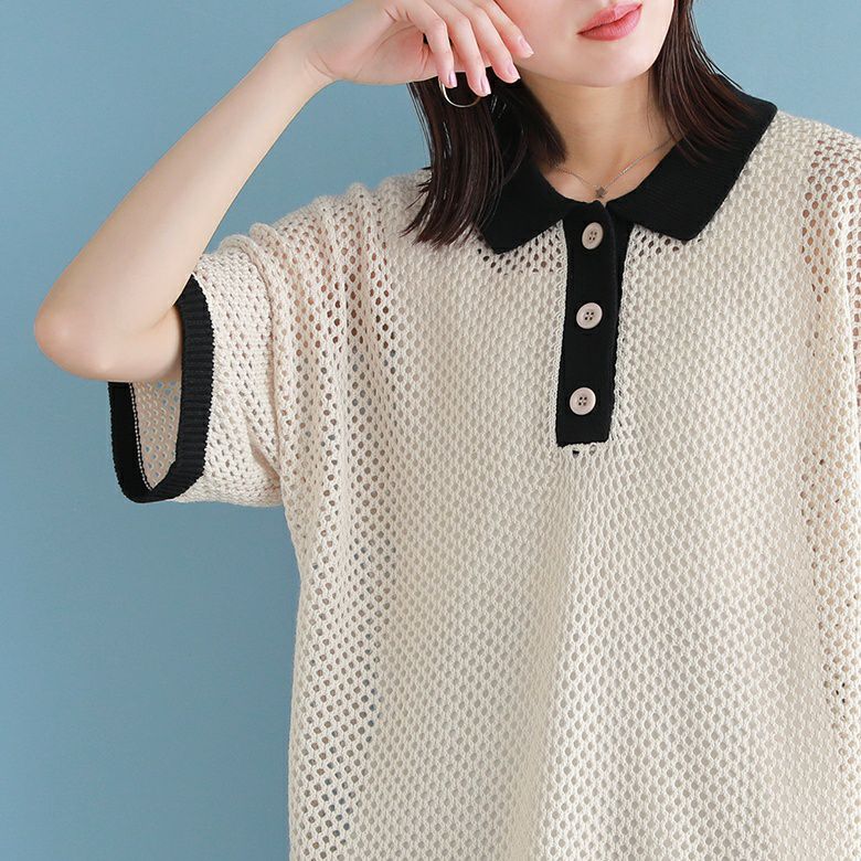 暑い季節も涼やかに着られる、配色メッシュポロニット♪