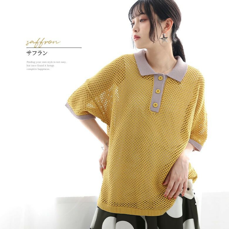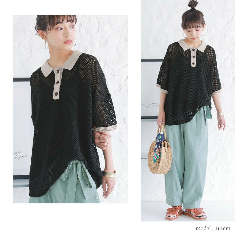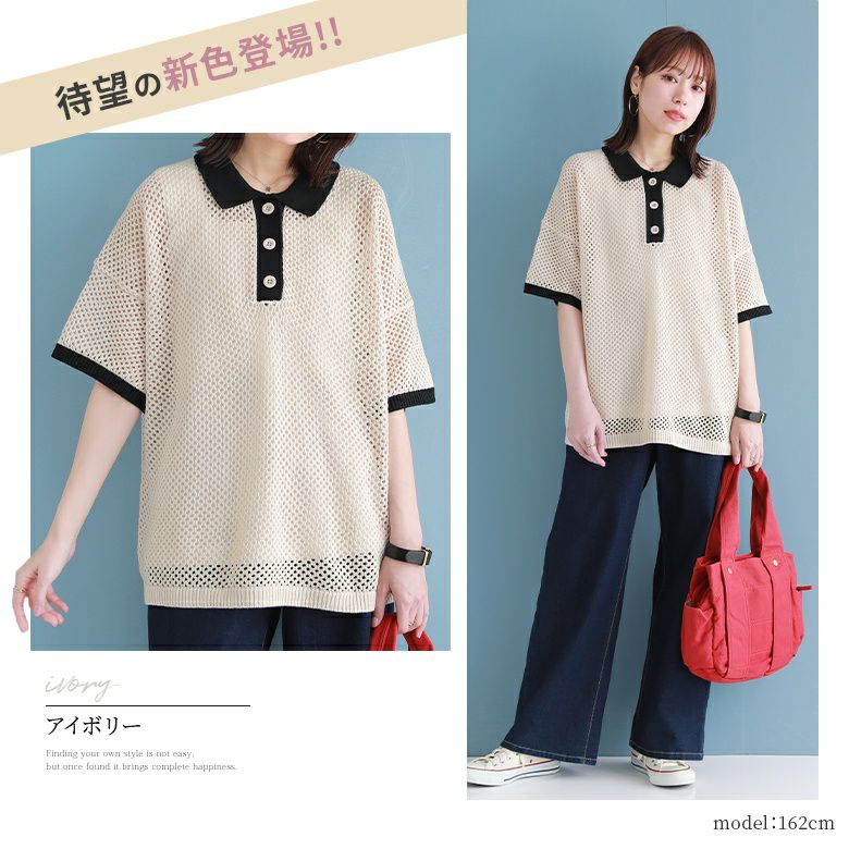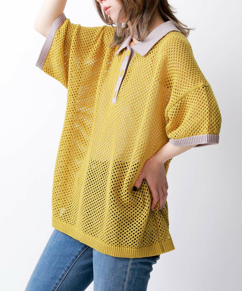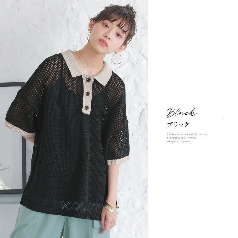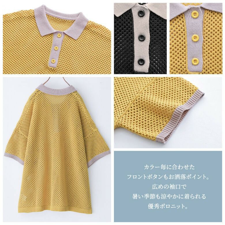 暑い季節も涼やかに着られる、配色メッシュポロニット♪