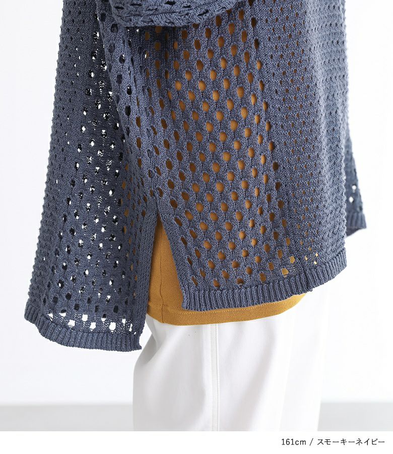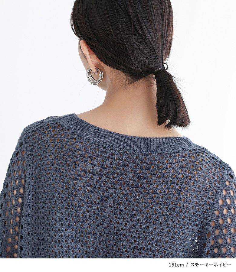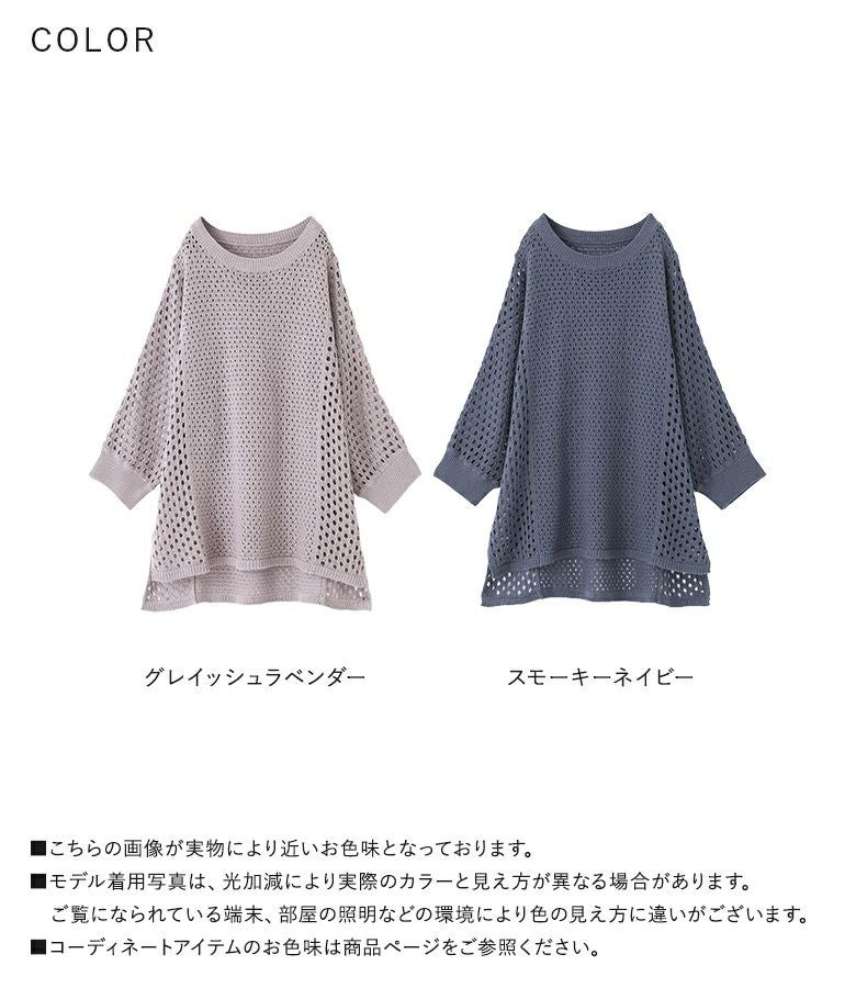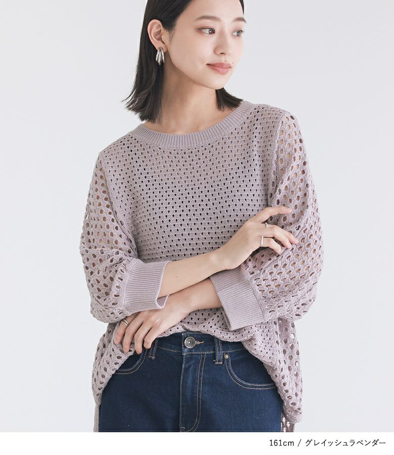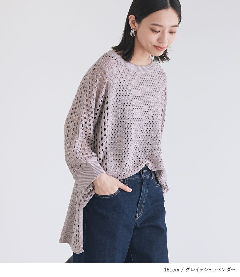 程よい透け感でレイヤードスタイルが楽しめる透かし編みニット。ゆったりと着られるドルマンシルエットと、ロングシーズンで活躍する七分袖で、コーデに取り入れるだけでお洒落な印象に。身頃は透けすぎず、脇から袖は編地を変化させたメッシュ生地がポイントになります。