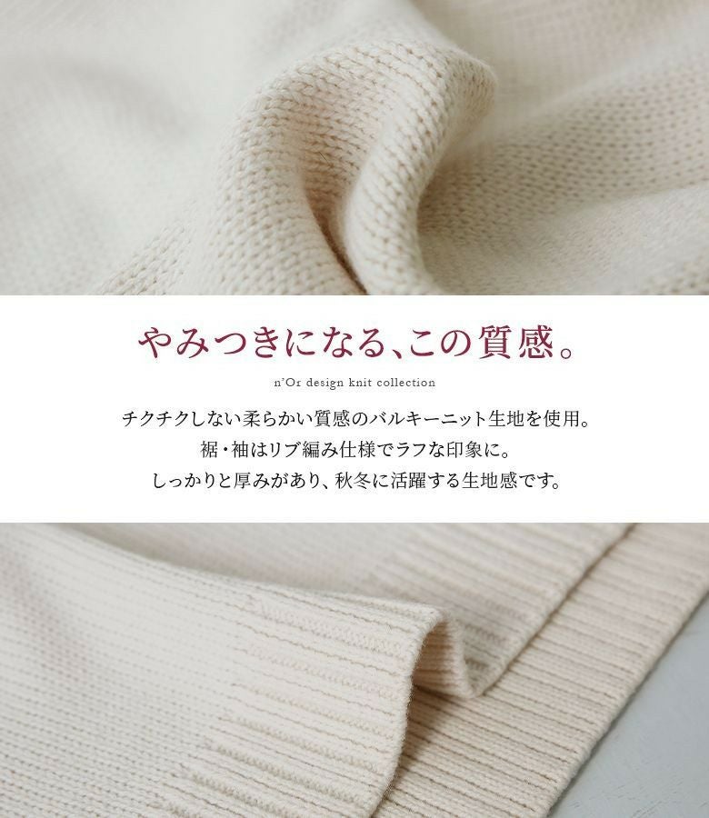 チクチクしない柔らかい質感のバルキーニット生地を使用。しっかりと厚みがあるので、これからの季節に活躍する生地感です。