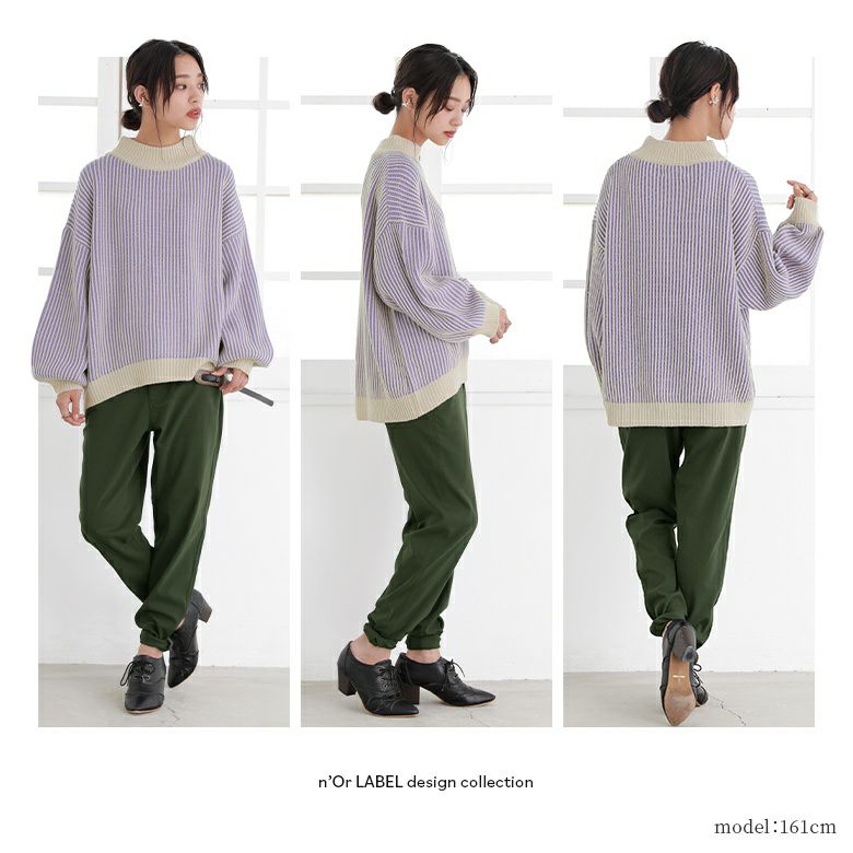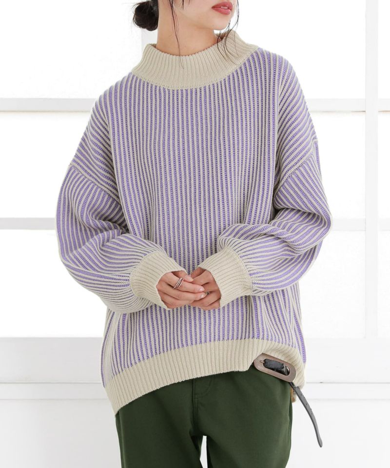 配色の畦編みにすることでストライプ柄に見える、程よい厚みのアクリルバルキーニットを使用。立体的な編地のふっくら柔らかい風合いとリブ編みとの切り替えでメリハリのあるシルエットに。