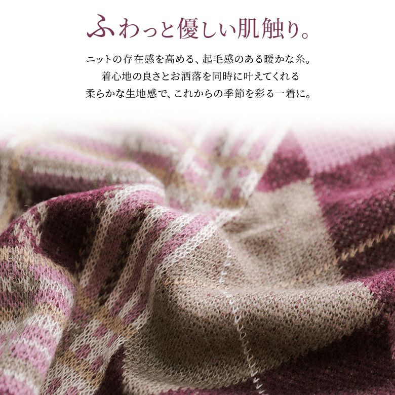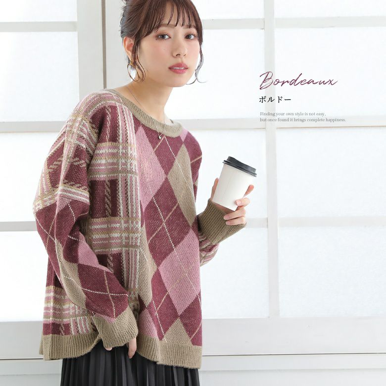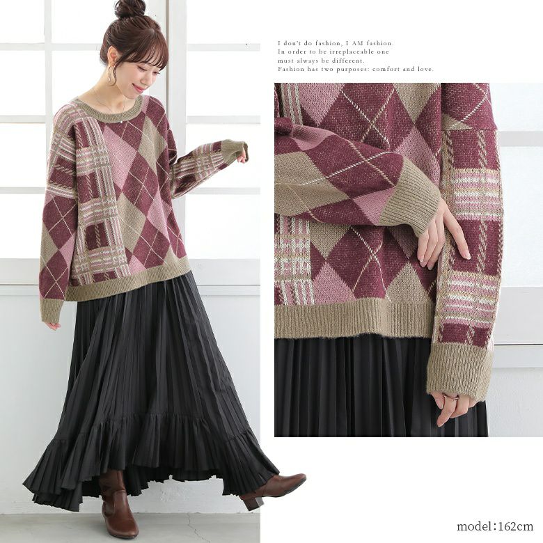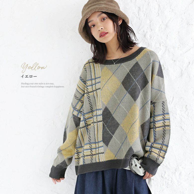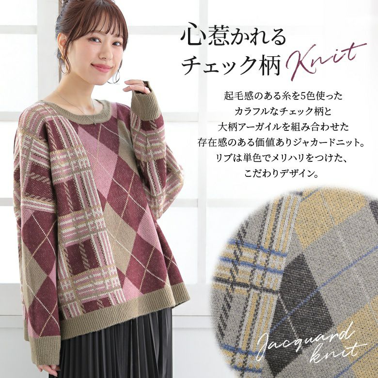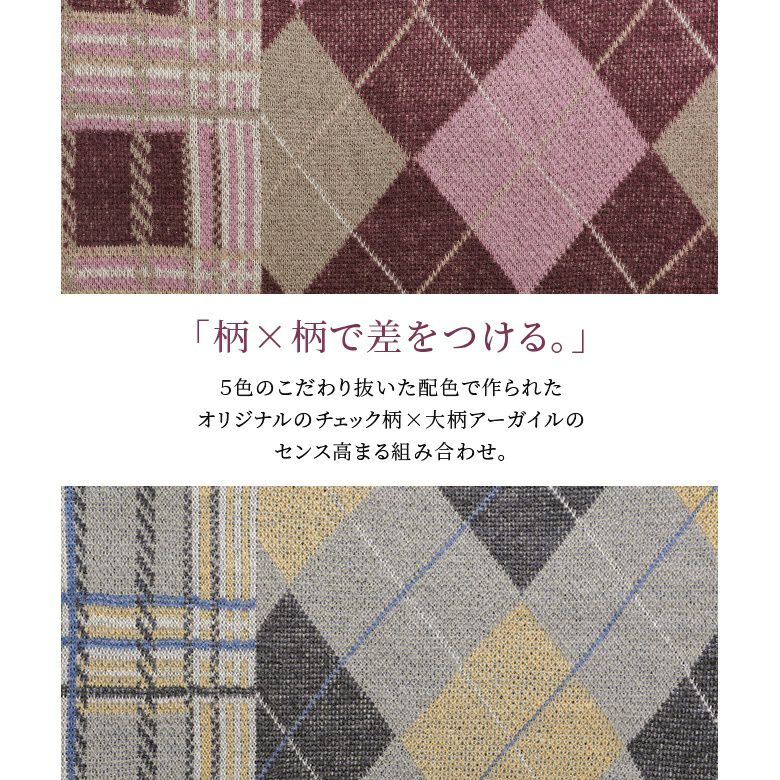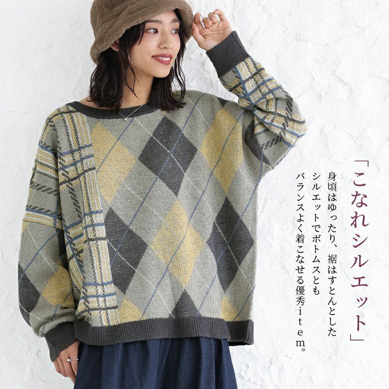 オリジナルのチェック柄×大柄アーガイルのセンス高まる組み合わせ。身頃はゆったり、裾はストンとしたシルエットで色々なボトムスともバランス良く着こなしていただけます。
