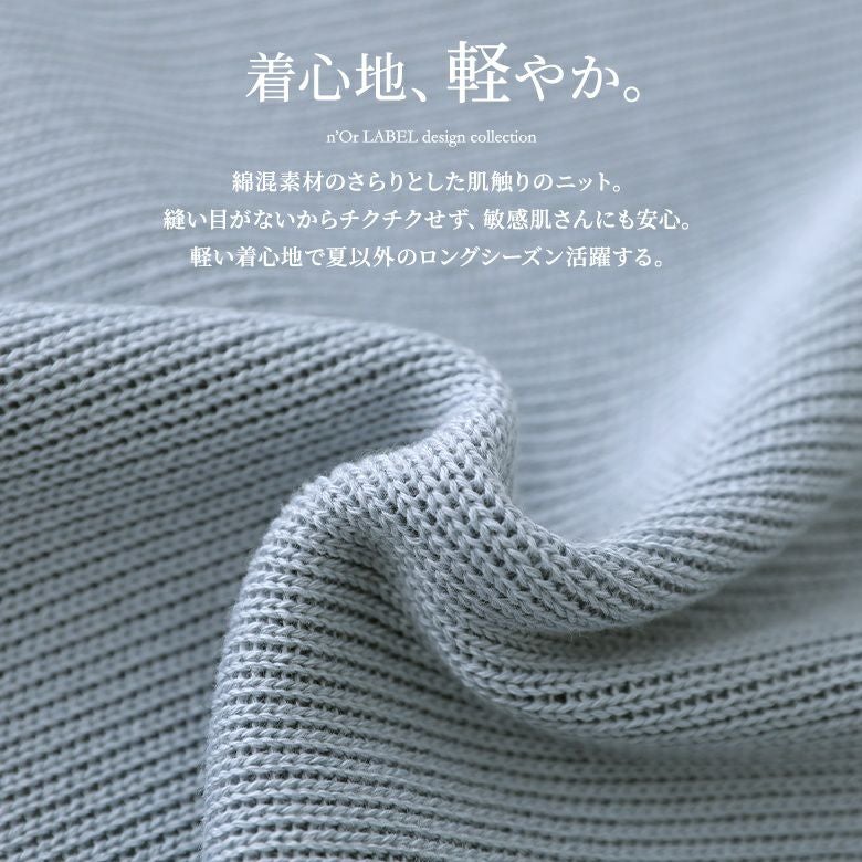 縫い目がないから快適な着心地と、ごわつきのない綺麗なシルエットを叶えてくれる。最小限の糸で編み上げる為、糸ロスが少ない"サスティナブル"も意識した、肌にも地球にも優しい日本製ニットです。