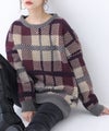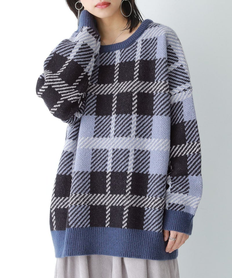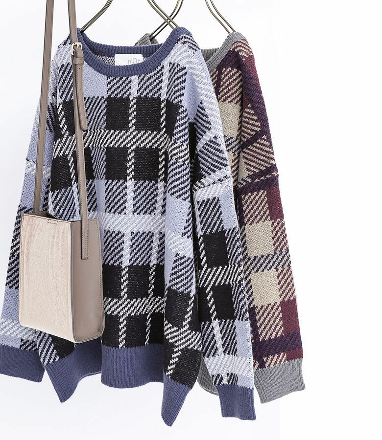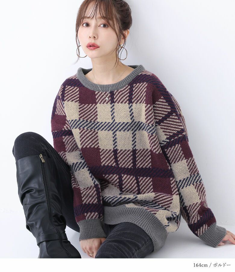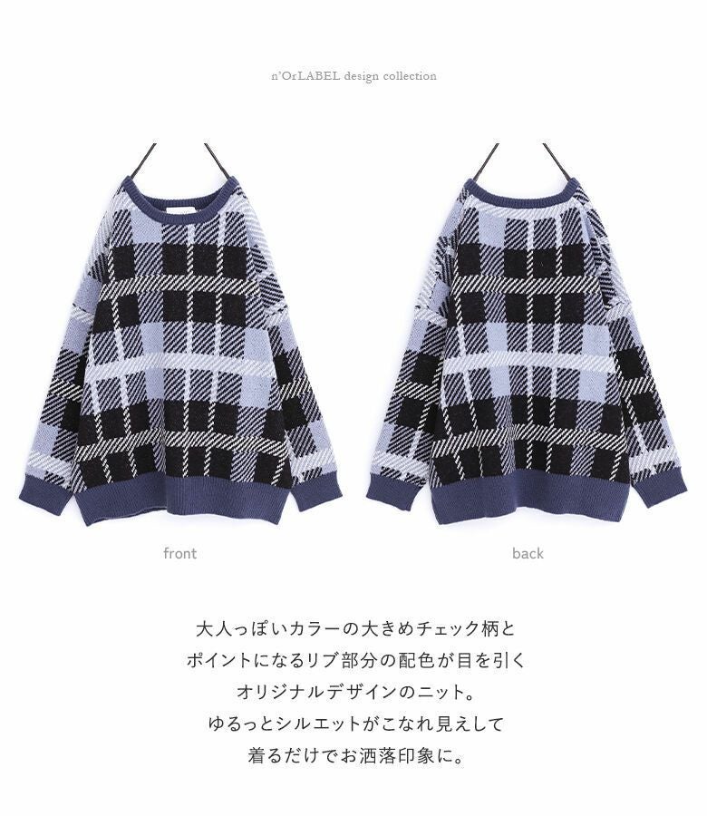 大人っぽいカラーの大きめチェック柄と、リブの配色がポイントになるオリジナルデザインのニット♪ゆるっとシルエットがこなれ見えして、着るだけでお洒落印象に。