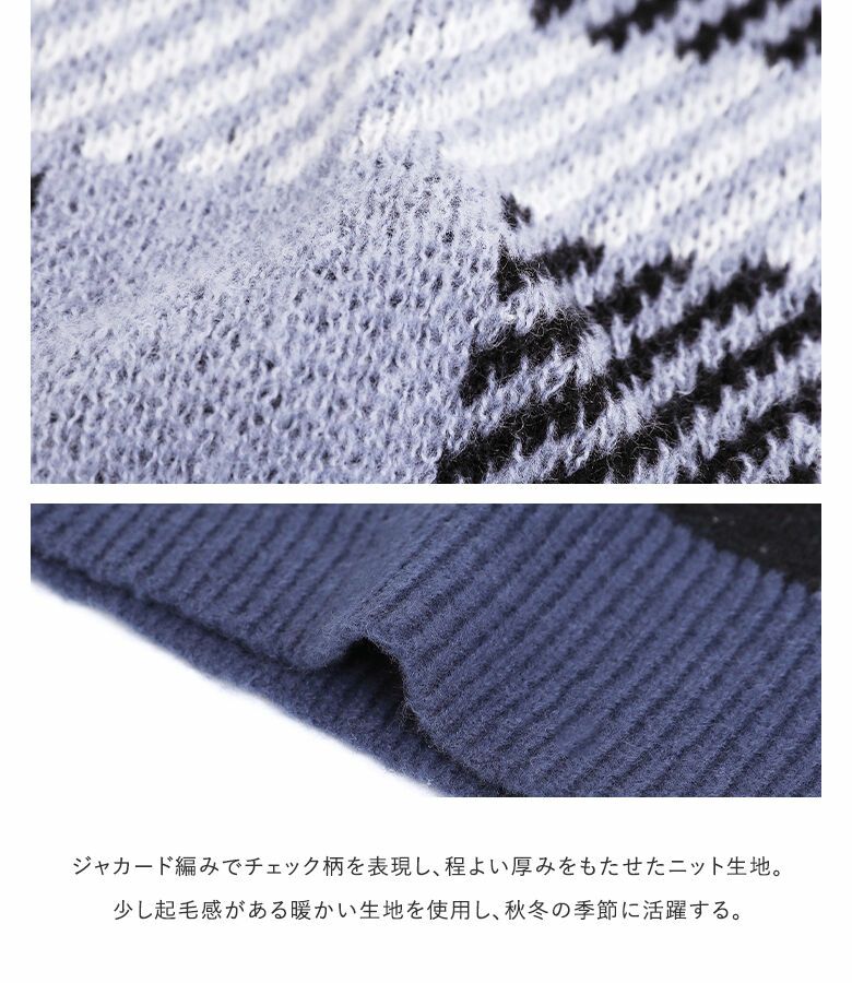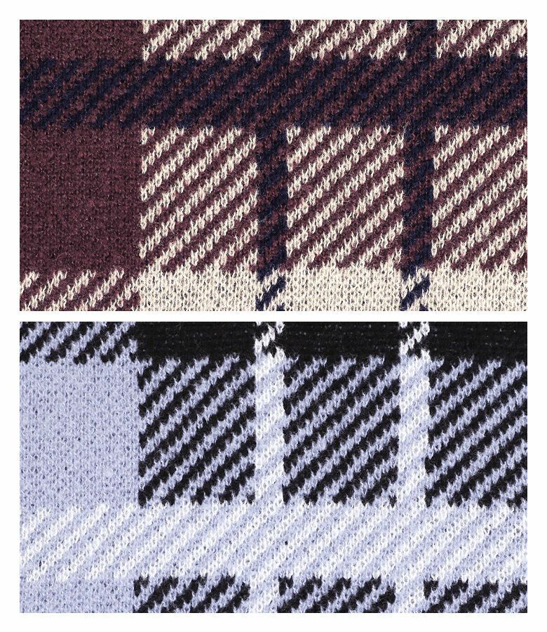 ジャカード編みでチェック柄を表現し、程よい厚みをもたせたニット生地。少し起毛感のある暖かい生地を使用し、寒い季節のお洒落に活躍します。