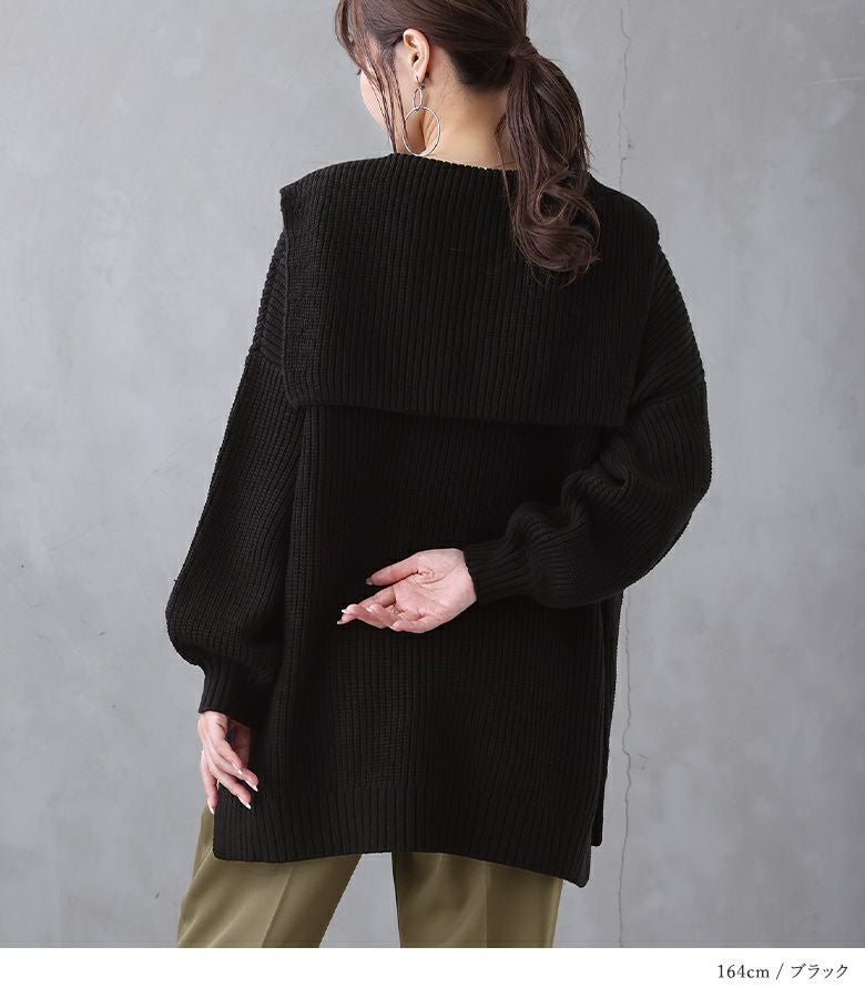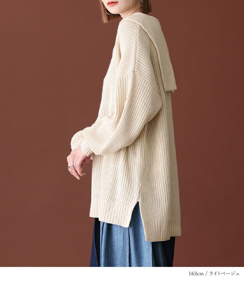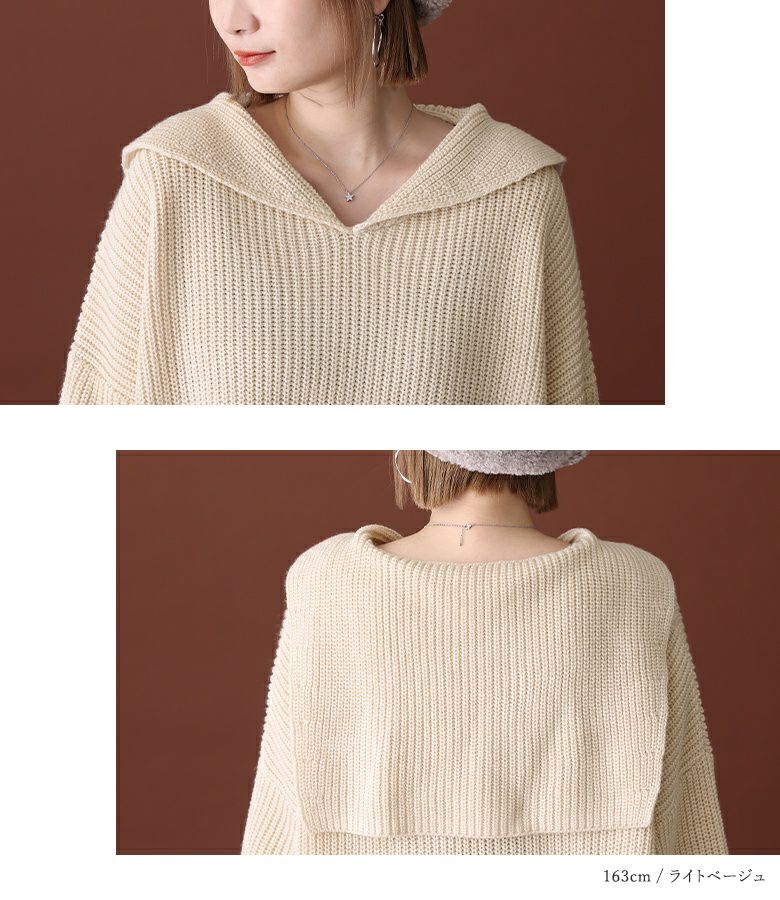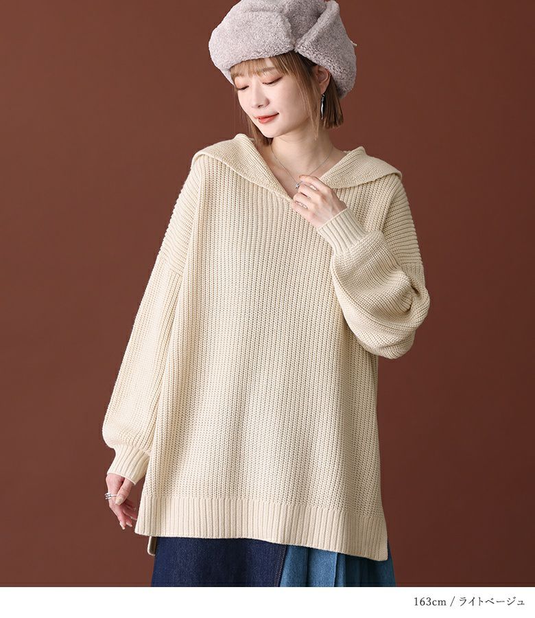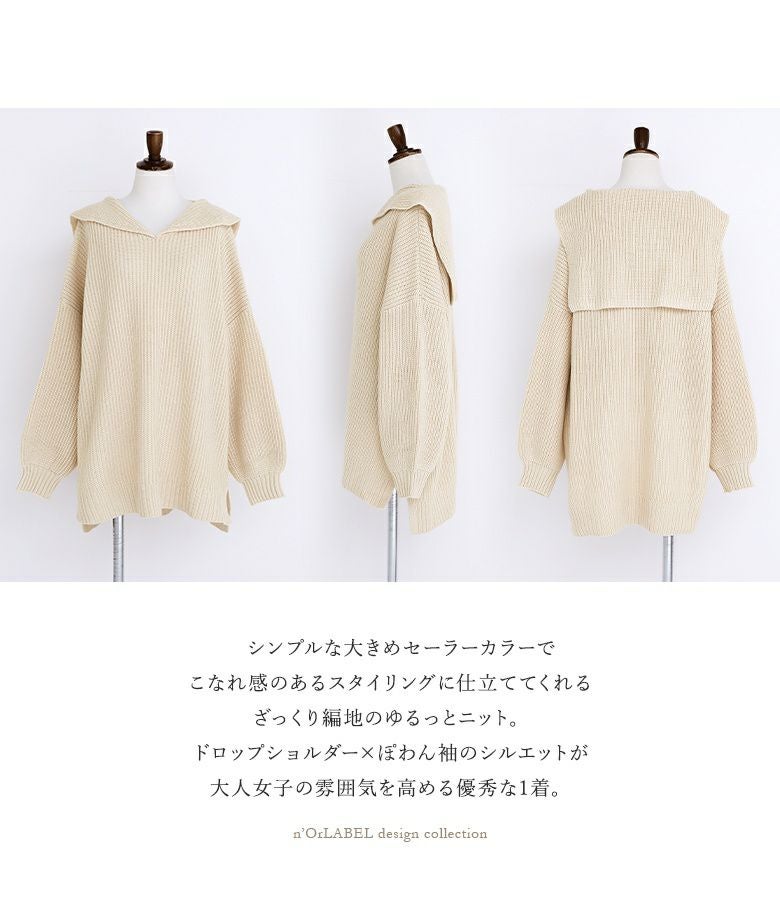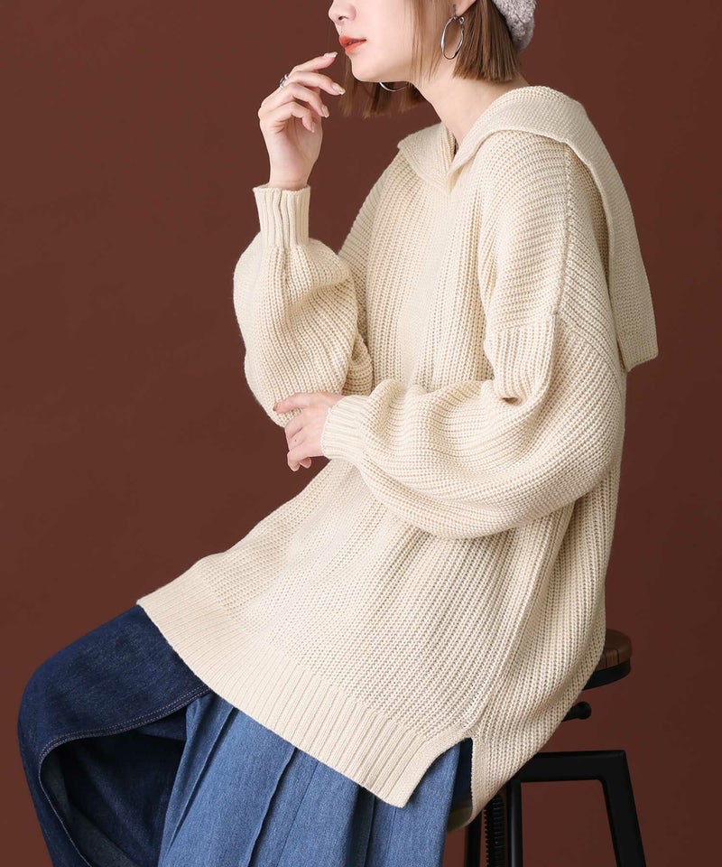 シンプルな大きめセーラーカラーでこなれ感のあるスタイリングに仕立ててくれる、ざっくり編地のゆるっとニット。