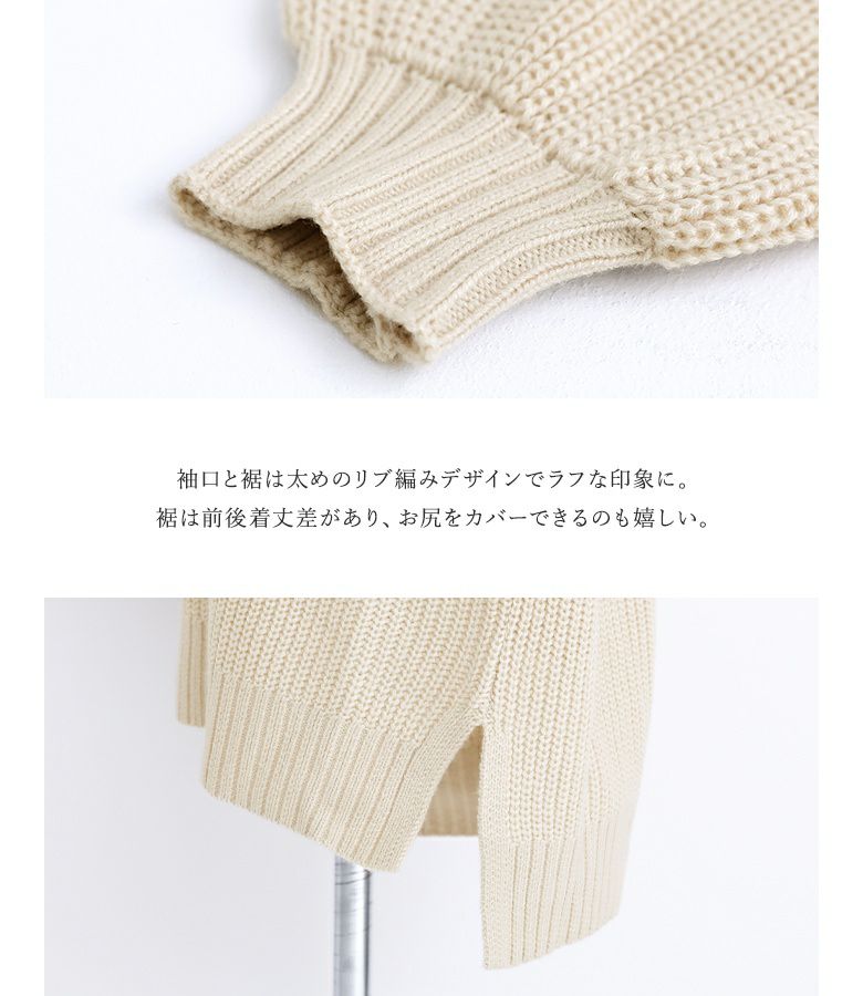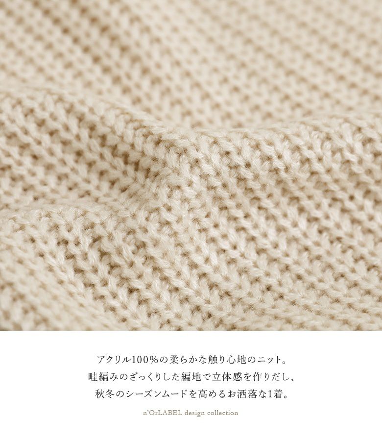 アクリル100%の柔らかな触り心地のニット生地を使用。畦編みのざっくりした編地で立体感を作り出し、これからの季節のムードを高めてくれるお洒落な一着。