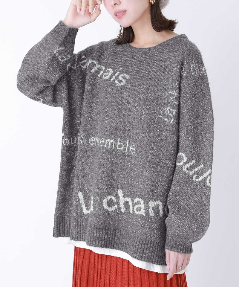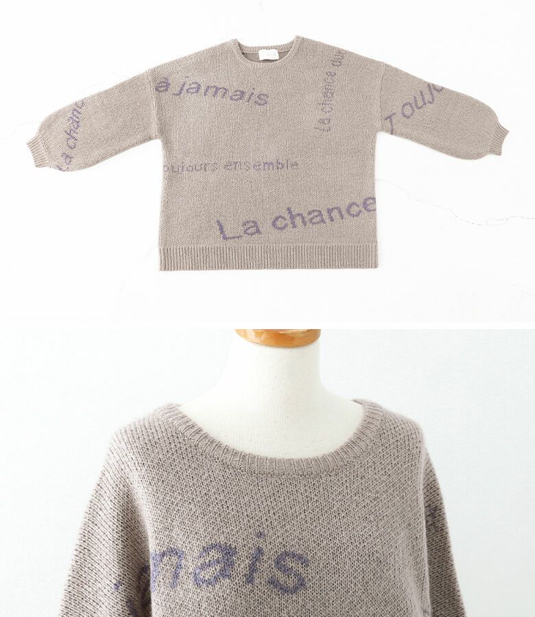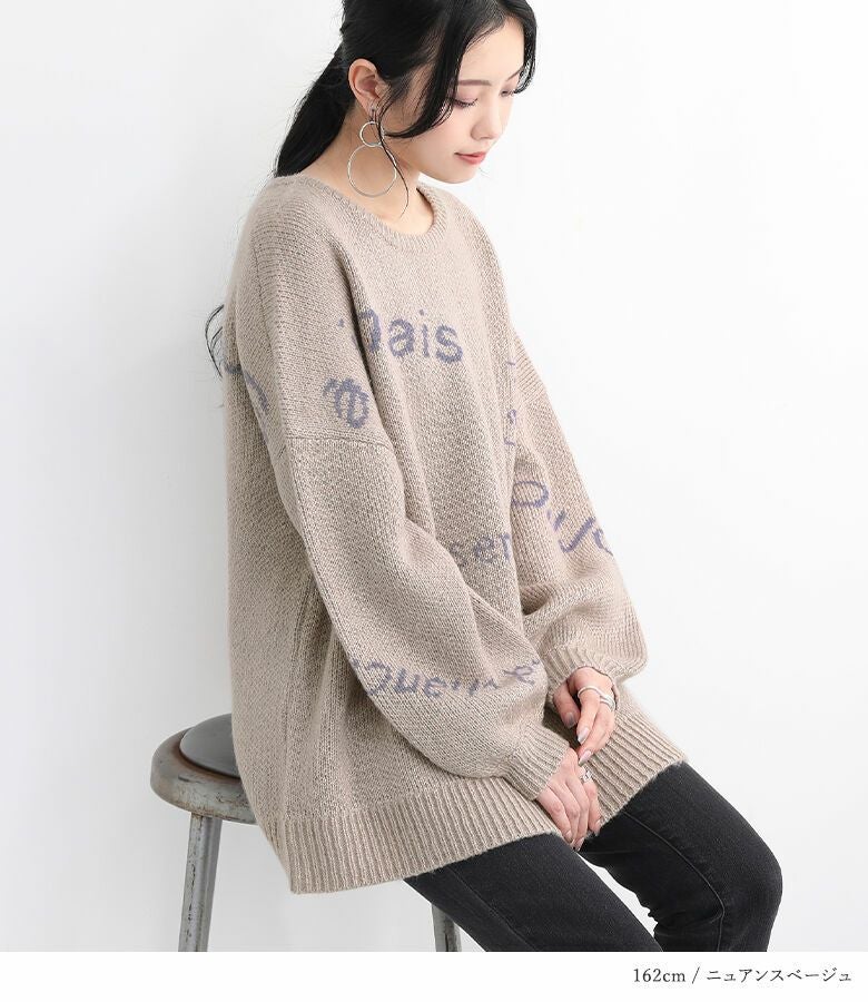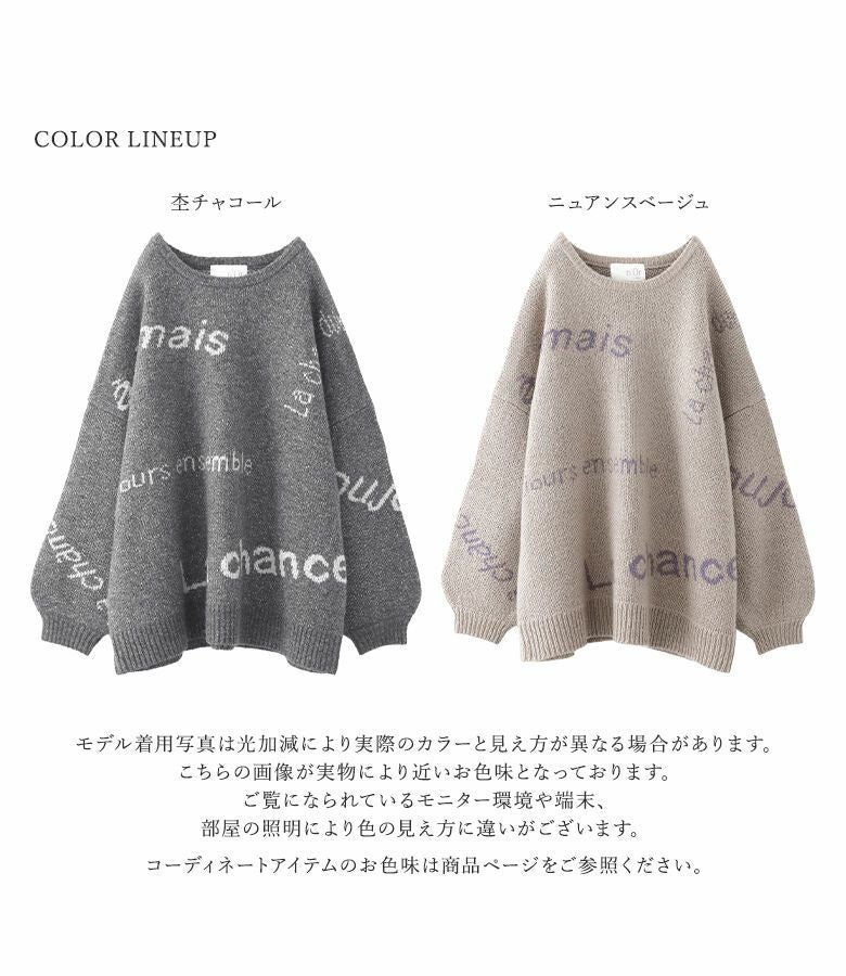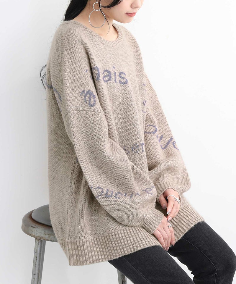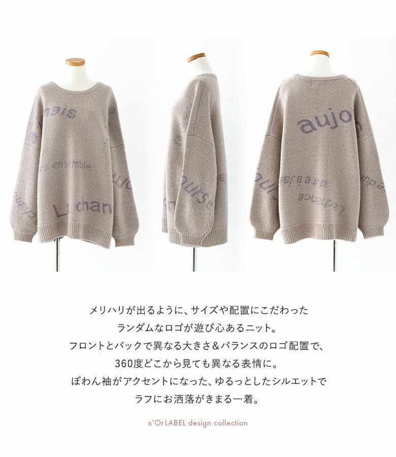 メリハリが出るように、サイズや配置にこだわったランダムなロゴが遊び心あるニット。ぽわん袖がアクセントになったゆるっとしたシルエットで、ラフにお洒落がきまる一着です。