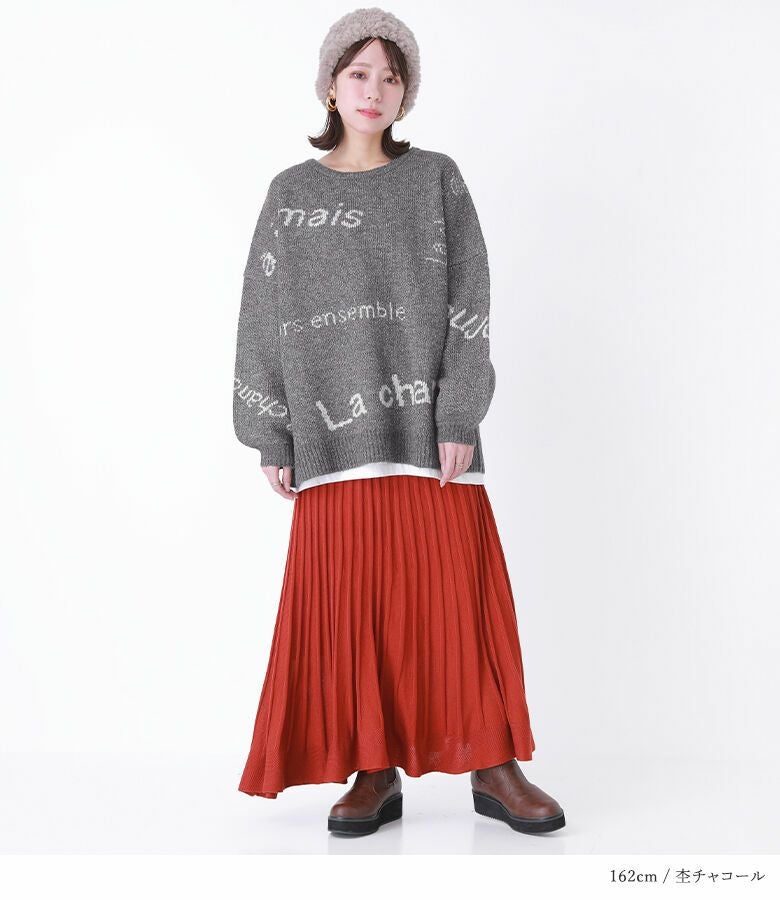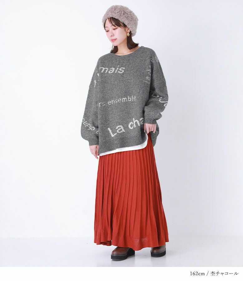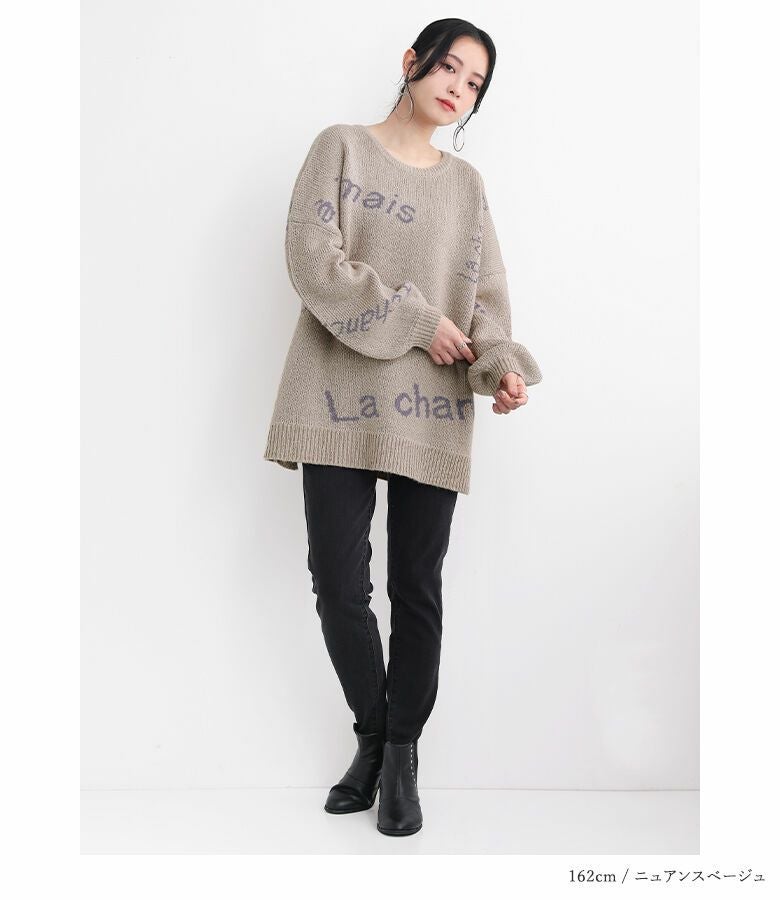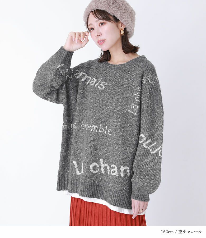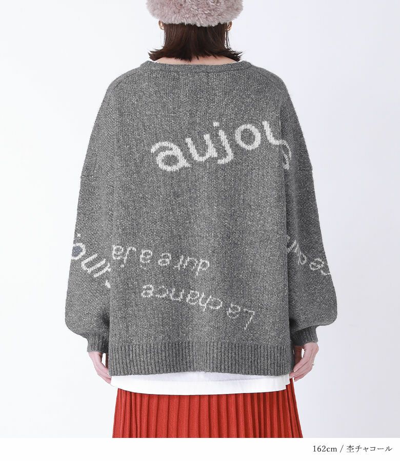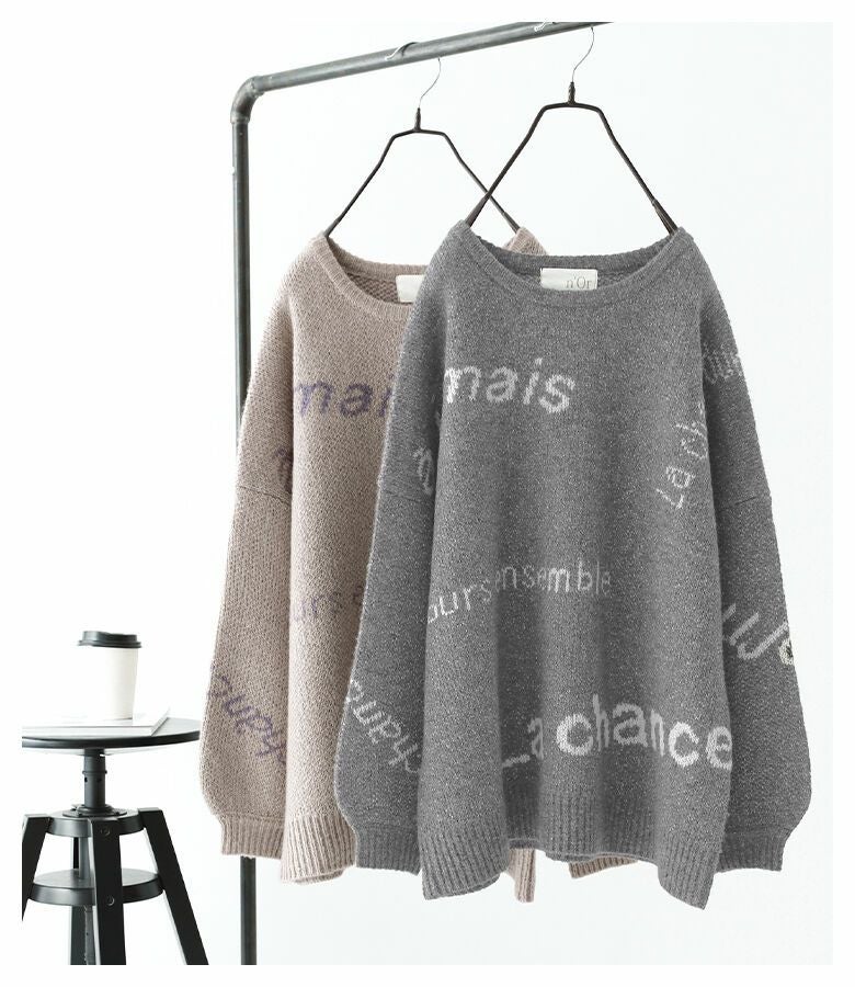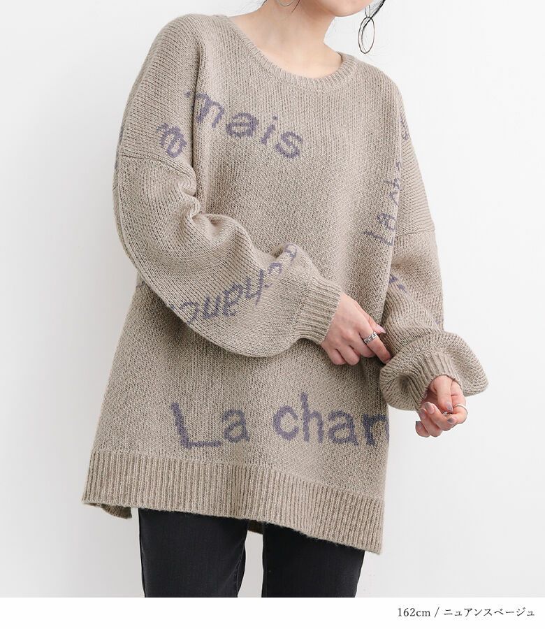 メリハリが出るように、サイズや配置にこだわったランダムなロゴが遊び心あるニット。ぽわん袖がアクセントになったゆるっとしたシルエットで、ラフにお洒落がきまる一着です。
