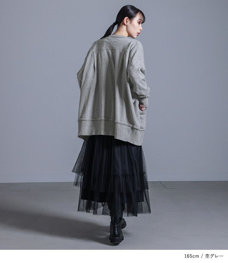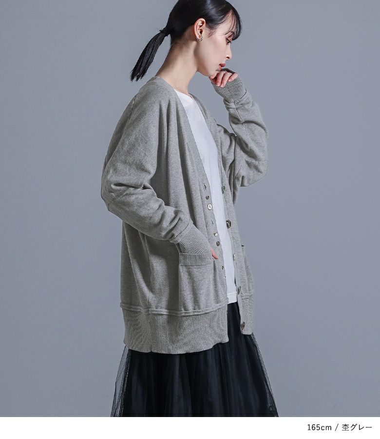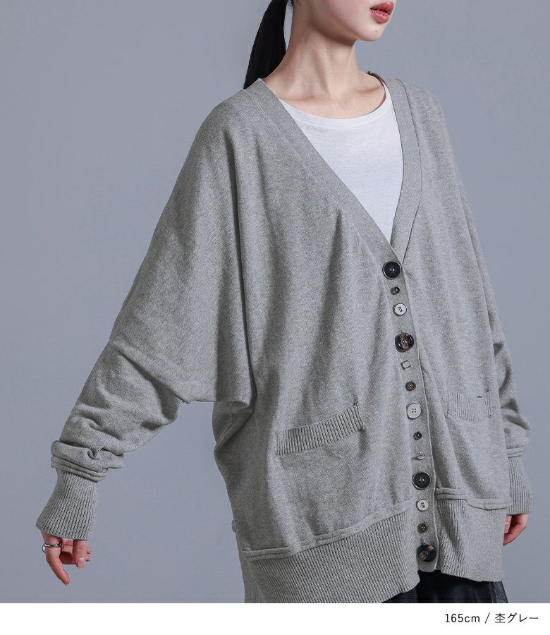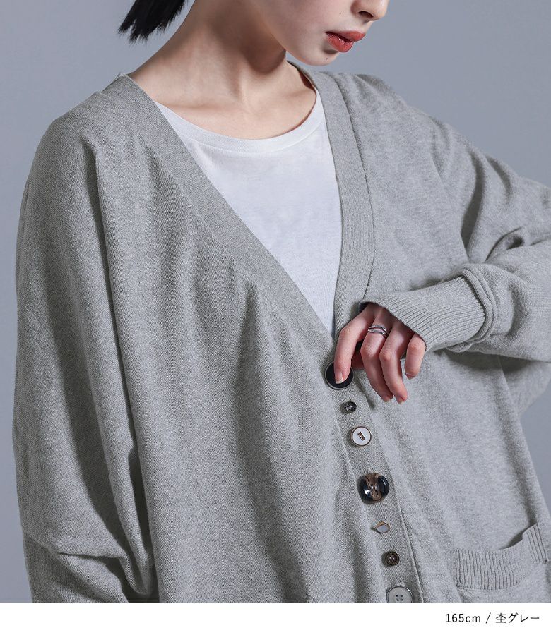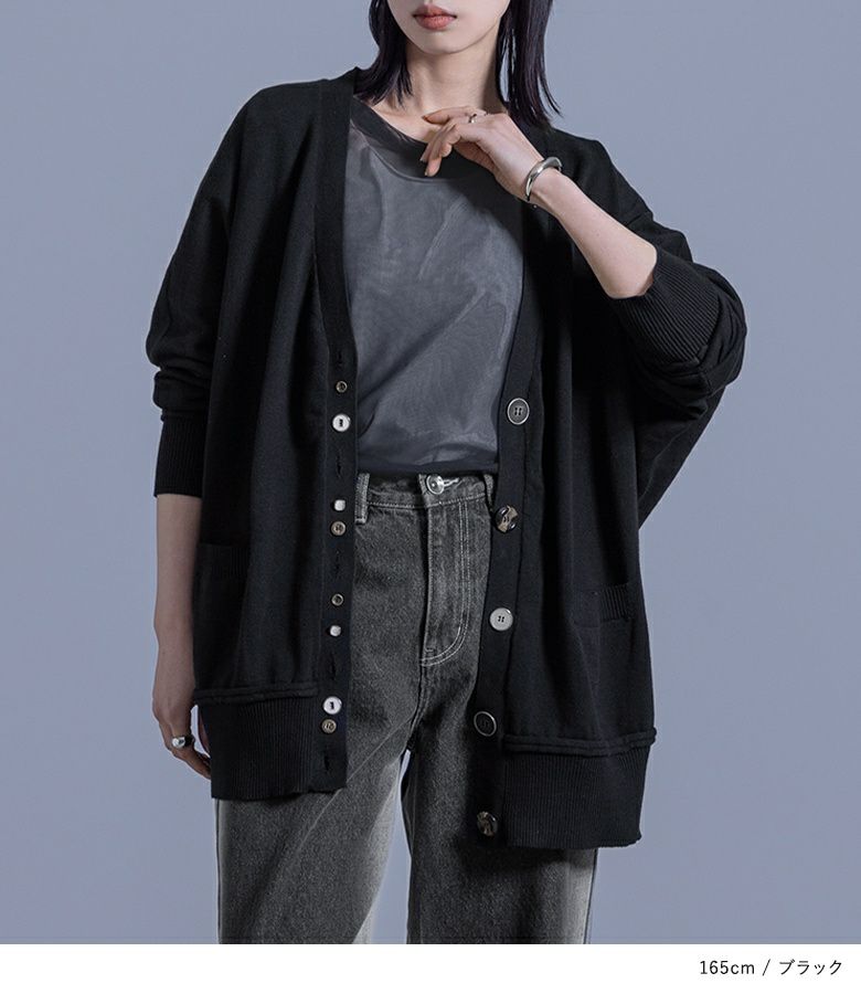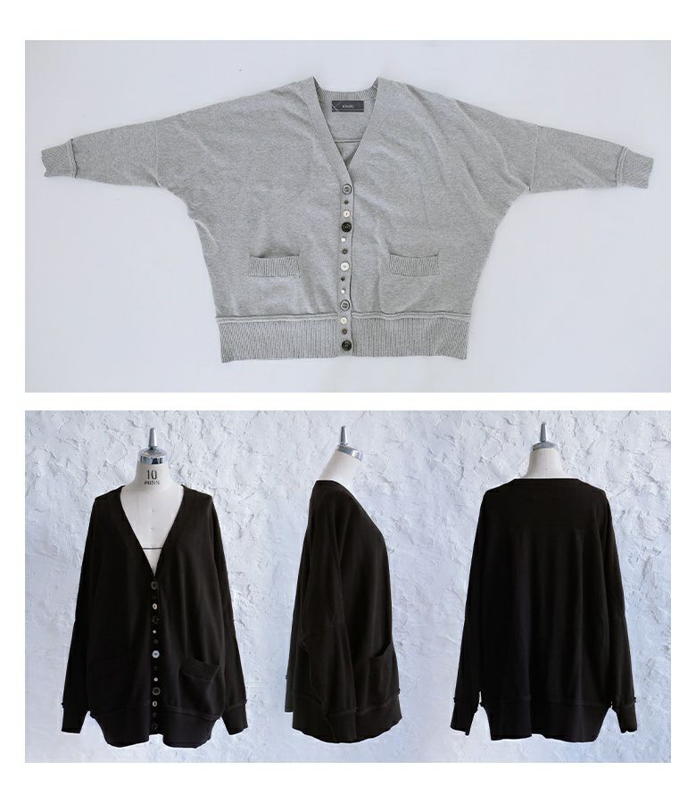 ボタンデザインが効いたモードな印象のカーディガン。ボタンホールの間にフェイクボタンを配置し、着脱もしやすい仕様です。袖と裾の切り替えはニットの特性を生かしたくるんとしたデザインに。ゆるっとしたシルエットでラフに羽織れる一着です。