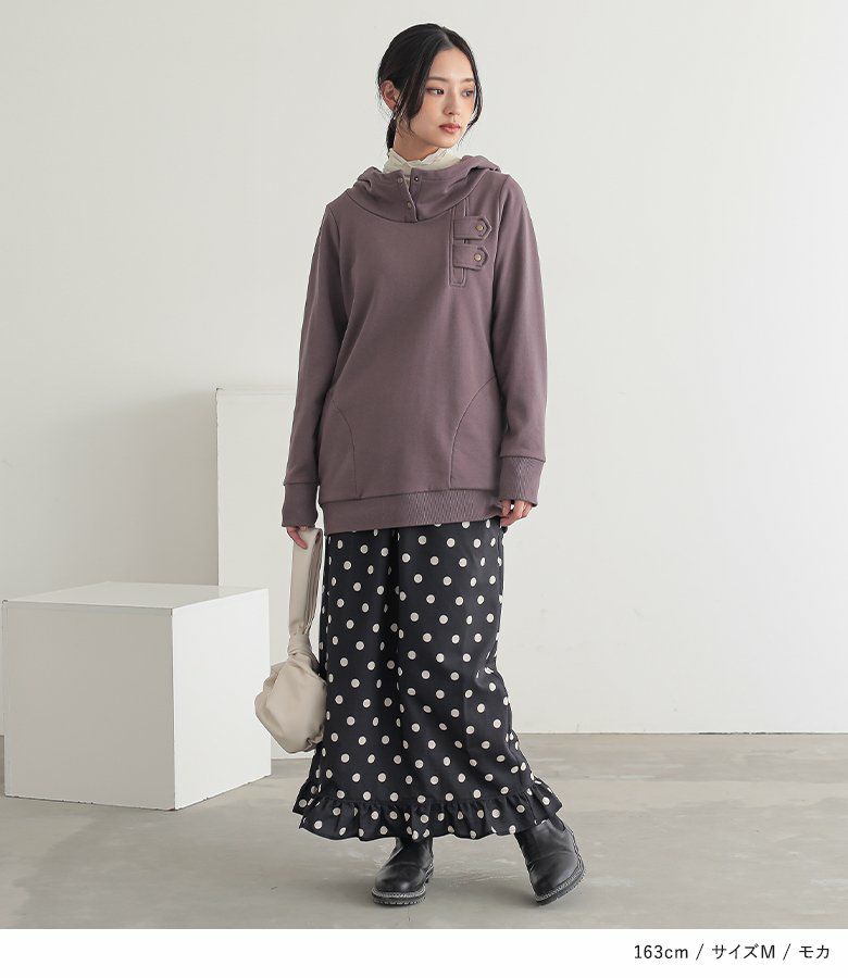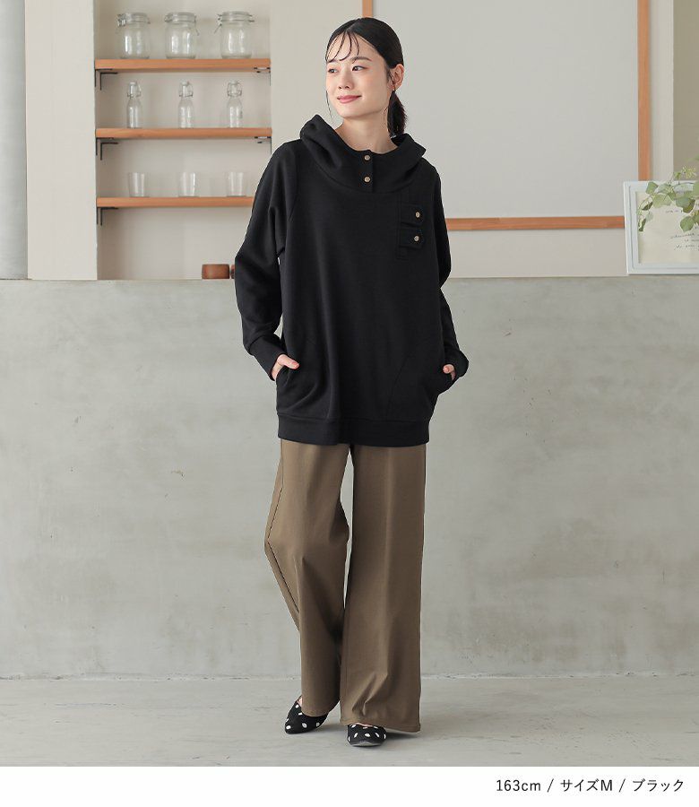 大きなフードと襟もとで顔まわりをグッとお洒落印象に。