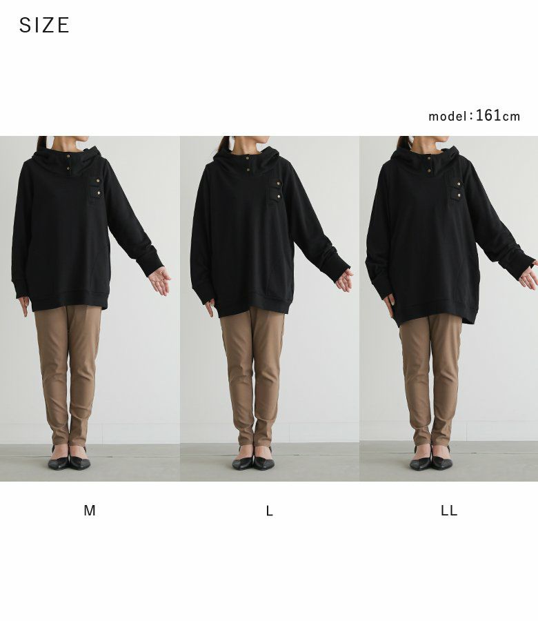 Mサイズは丁度良いサイズ感で可愛く着られました。Lサイズは程よくゆとりがあり、少しゆる感を持って着られました。LLサイズは全体的にゆったりしていてゆるっと可愛く着られました。